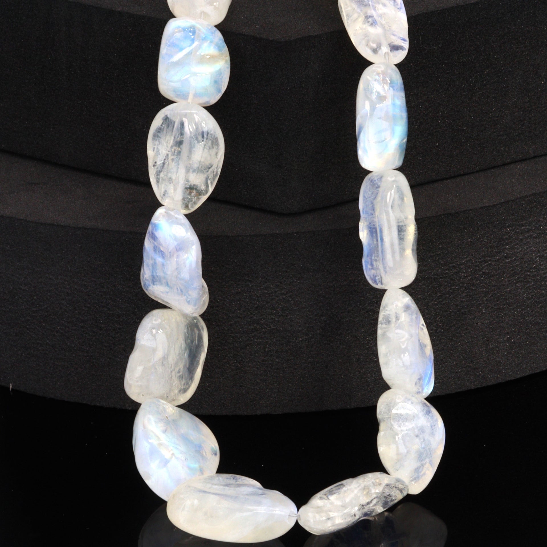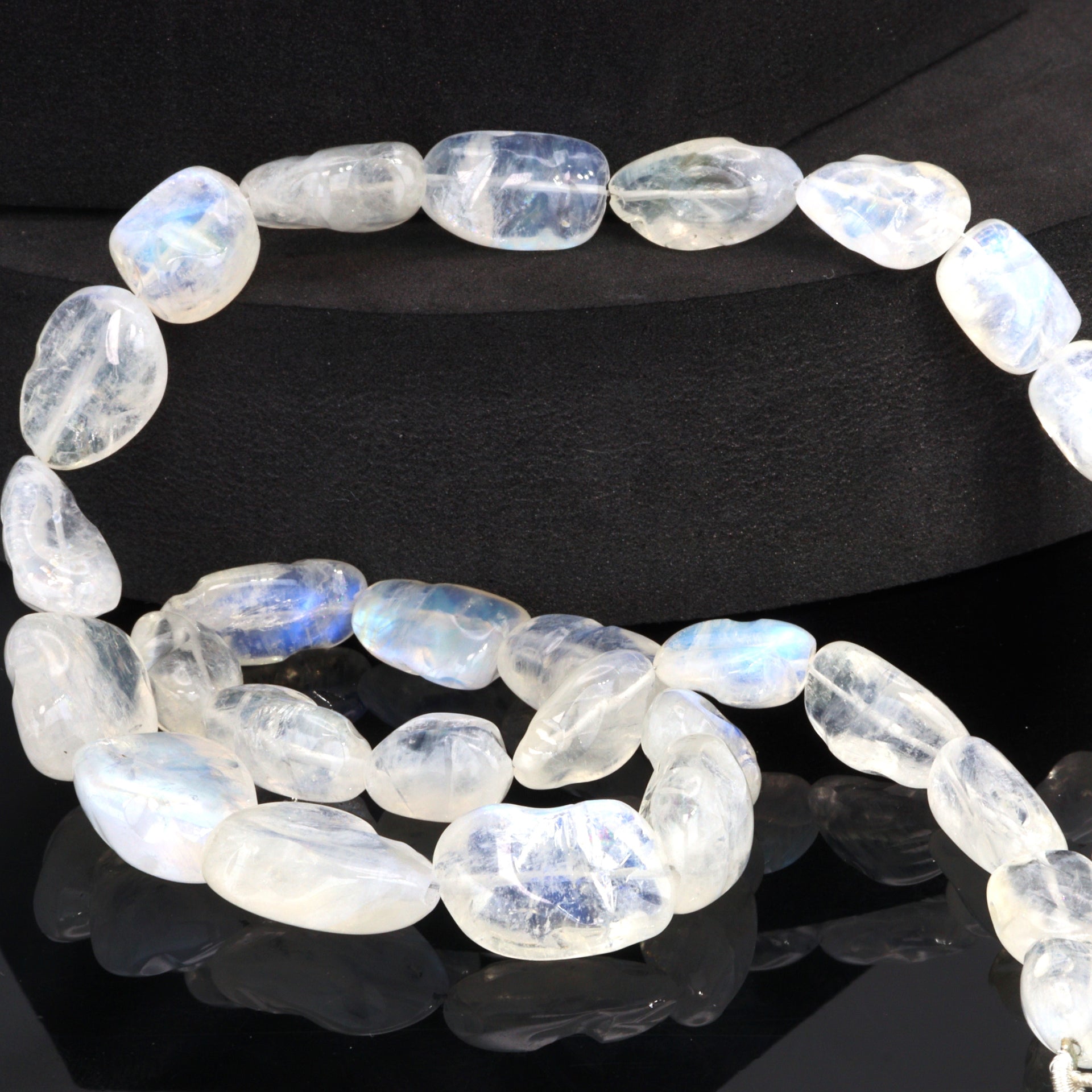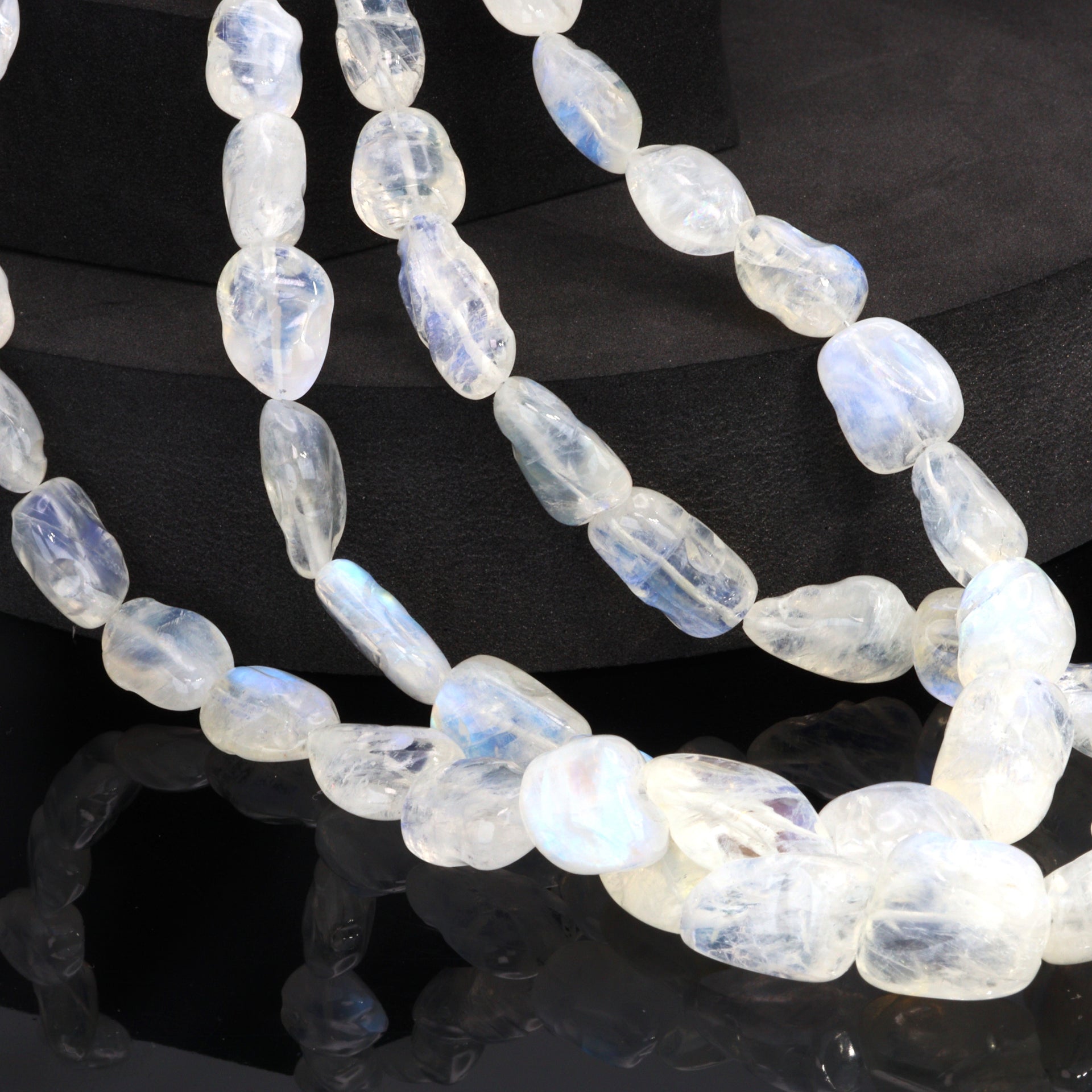 Elevate your jewelry designs with the mystical allure of our Blue Rainbow Moonstone Organic Tumbled Smooth Nuggets. Each strand features an array of moonstone nuggets, tumbled to perfection to reveal their natural, smooth forms. These nuggets capture the enchanting essence of moonstone, known for its iridescent blue sheen that dances across the surface, reminiscent of moonlight glinting on tranquil waters. The organic shapes of these nuggets provide a unique, earthy aesthetic to any piece, making them ideal for creating jewelry that embodies both a natural and sophisticated charm. Perfect for designers aiming to craft statement pieces or add a touch of whimsy to their collections, these moonstone nuggets are versatile in use, from bold necklaces to charming bracelets and earrings. Revered for its connection to intuition and emotional balance, blue rainbow moonstone adds not just visual appeal but also a sense of serenity and depth to your creations. For those seeking to infuse their jewelry lines with the magic of natural gemstones, our Blue Rainbow Moonstone Organic Tumbled Smooth Nuggets offer an exquisite blend of beauty, mystique, and organic elegance.