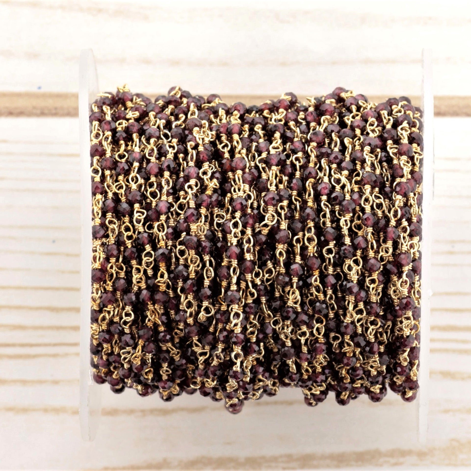 Red Garnet 2mm Faceted Rounds Rosary Chain Sterling Silver with Gold Plating Wire Wrap Chain by the Foot