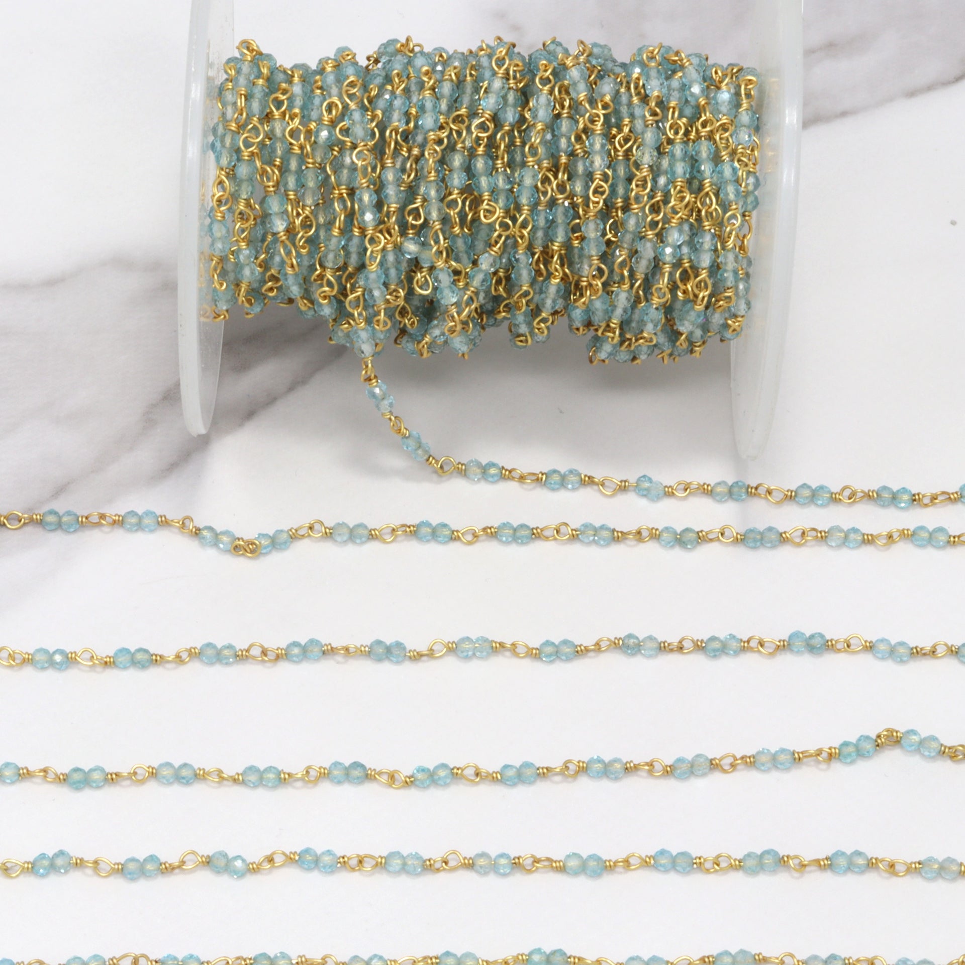 Sea Blue Apatite 2.5mm Faceted Rounds Rosary Chain Sterling Silver with Gold Plating Double Bead Wire Wrap Chain by the Foot
