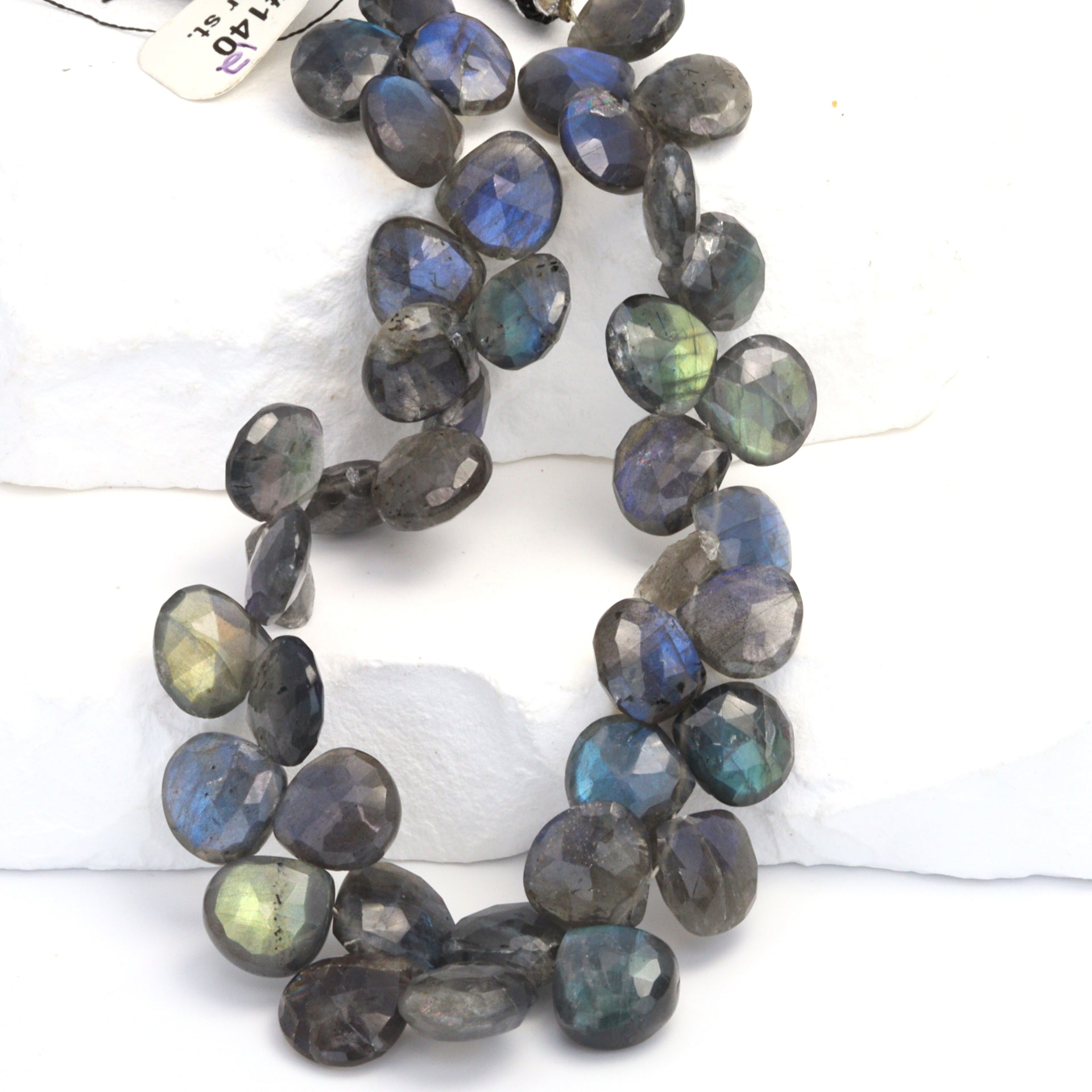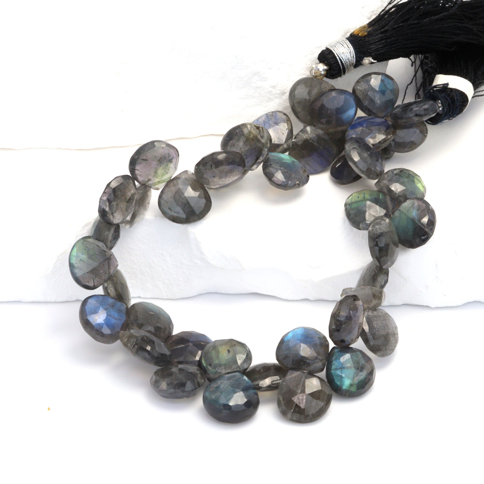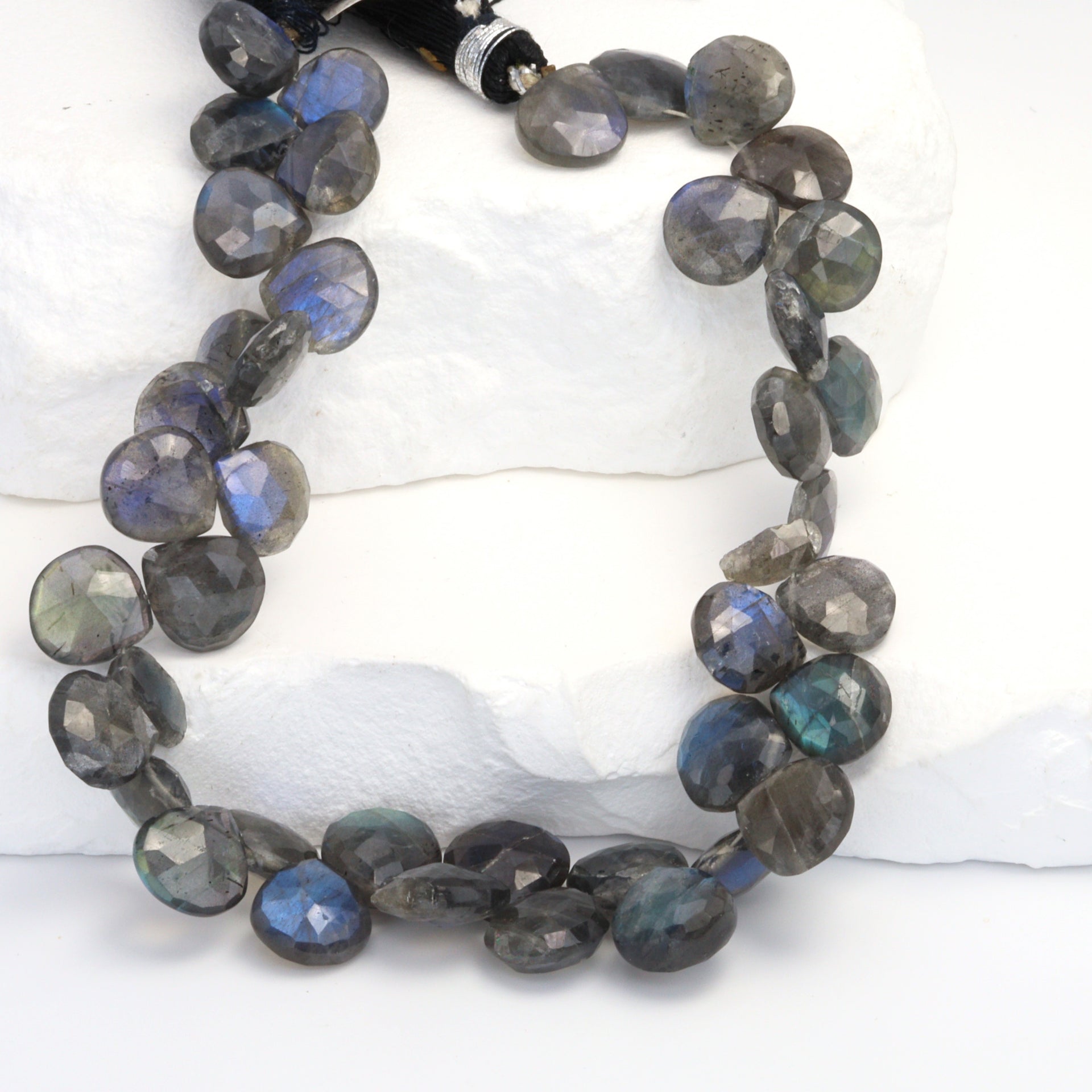 Discover the enchanting allure of our 8" Full Bead Strand of AA Dark Blue Labradorite Faceted Heart Shaped Briolettes. Each 10mm bead is meticulously crafted to showcase the captivating hues and shimmering iridescence of high-quality AA Labradorite. These dark blue gemstone beads, with their unique heart-shaped faceted design, are perfect for creating stunning, eye-catching jewelry pieces. As a trusted gemstone wholesaler, we ensure that every bead strand we supply is of the highest quality, promising durability and long-lasting beauty. Whether you're a jewelry designer or a jewelry store owner, these Labradorite beads will undoubtedly add a touch of elegance and sophistication to any jewelry collection.