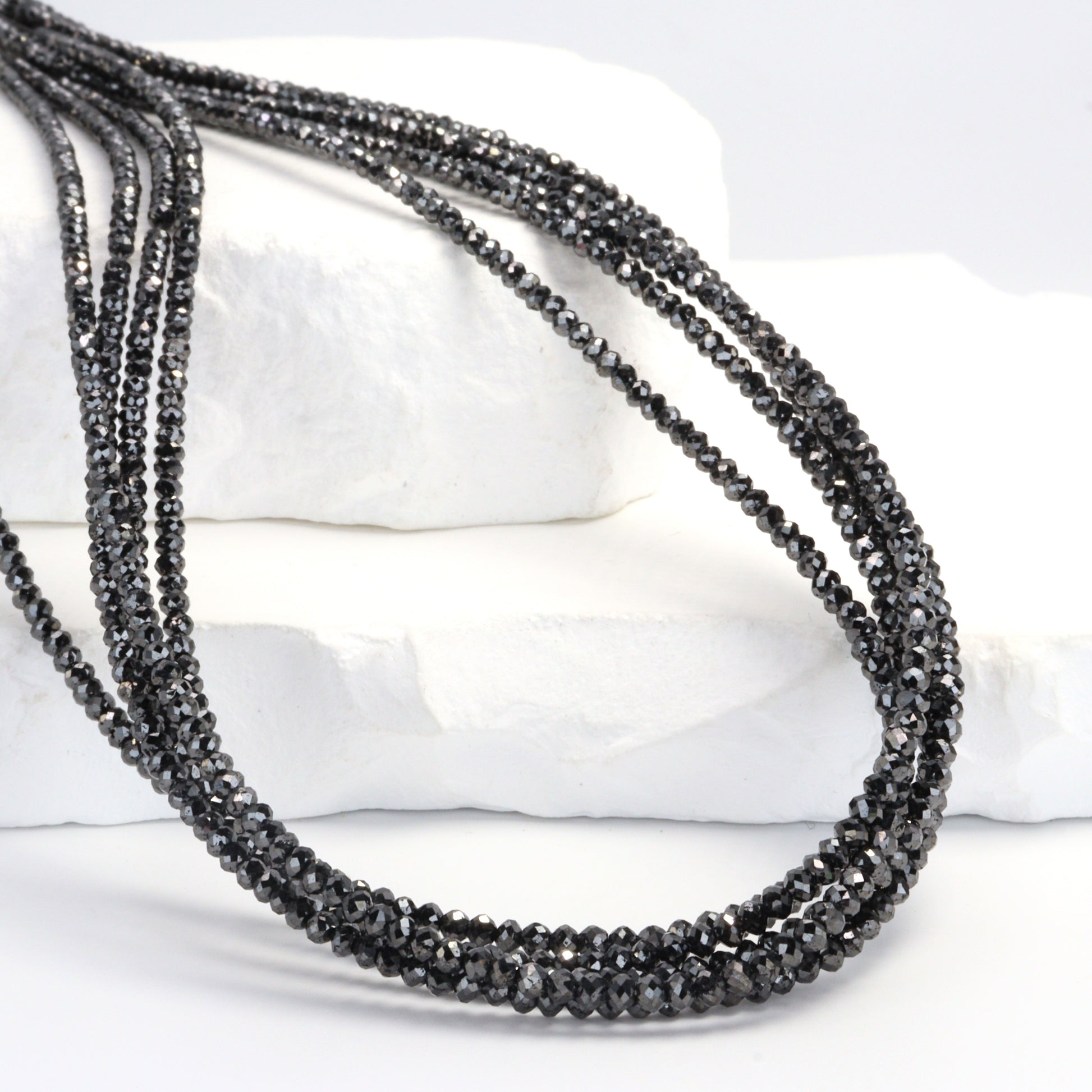 Elevate your jewelry designs with the unmatched elegance of our High-Quality Black Diamond 2.4-2.7mm Faceted Rondelle Beads. This exquisite strand offers a sophisticated palette of deep, enigmatic black, showcasing the allure and luxury of black diamonds. Each bead, ranging in size from 2.4 to 2.7mm, is masterfully faceted, ensuring a captivating sparkle that draws the eye and holds attention. The subtle variation in size adds a unique, artisanal touch to the strand, perfect for creating high-end, bespoke jewelry pieces. Black diamonds are renowned not only for their bold, striking appearance but also for their symbol of strength and eternal beauty, making these beads an ideal choice for designs that speak of elegance and timelessness. Ideal for crafting exquisite necklaces, bracelets, or statement earrings, these beads offer a touch of refined sophistication and contemporary style. For jewelers and designers aiming to offer luxury and distinctiveness, our Black Diamond Faceted Rondelle Beads are a premium selection, promising to infuse your creations with a sense of opulence and modern allure.