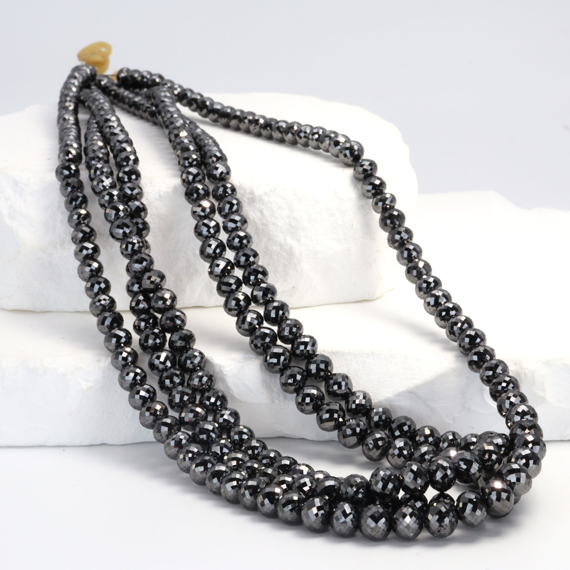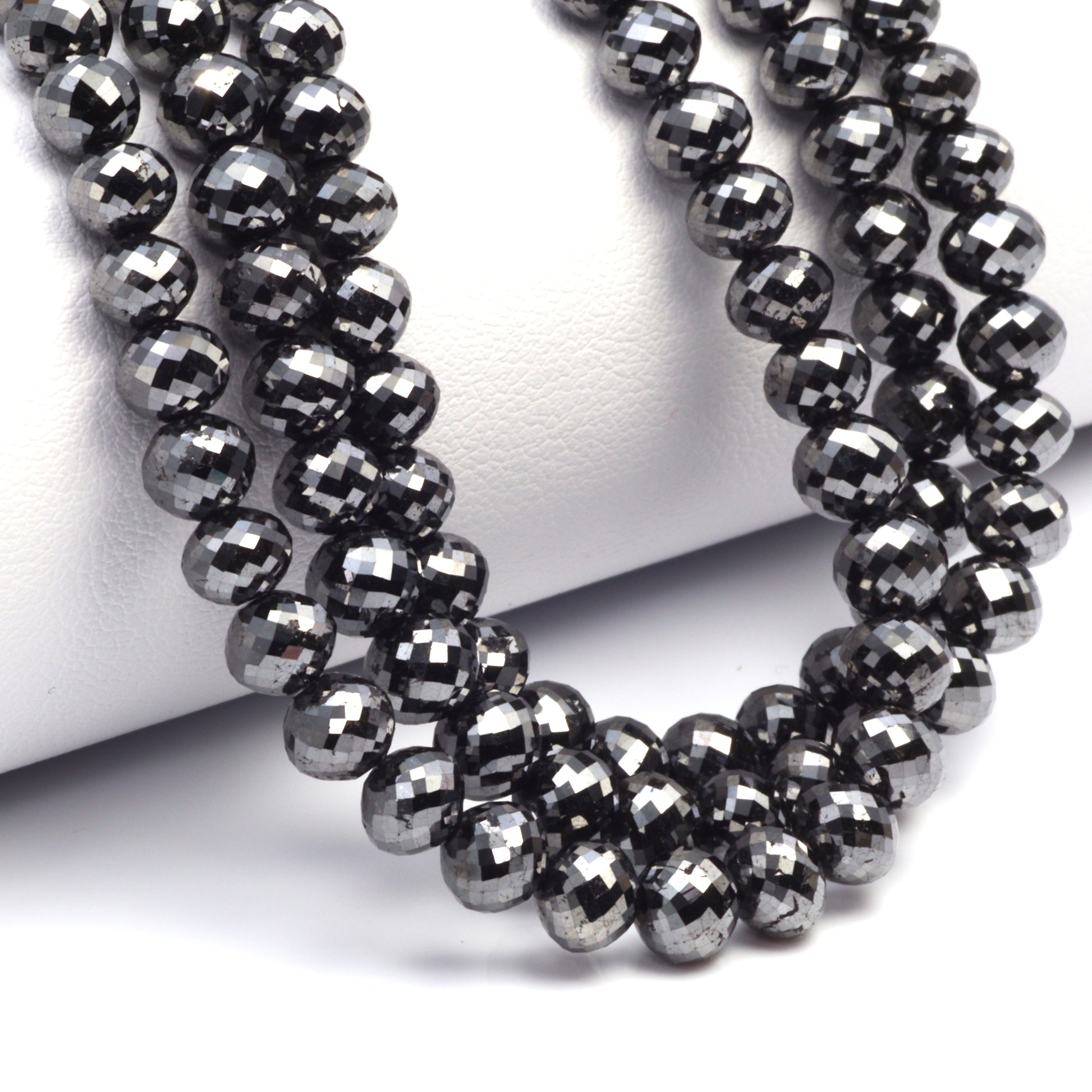 Elevate your jewelry designs with the luxurious allure of our Black Diamond 4.5mm - 6mm Faceted Ball Cut Rondelle Beads. This exquisite strand offers an array of finely crafted beads, each one a testament to the timeless elegance and captivating mystery of black diamonds. Ranging in size from 4.5mm to 6mm, these rondelle beads are expertly faceted with a ball cut technique, ensuring a sophisticated sparkle and an intense depth of color. The smooth gradation in size adds a dynamic and visually intriguing element to your creations, perfect for crafting statement pieces or adding a touch of opulence to more understated designs. Black diamonds are renowned not only for their bold aesthetic but also for their representation of strength and power, making these beads an ideal choice for creating jewelry that's as meaningful as it is beautiful. Perfect for high-end jewelry designers and upscale boutiques, our Fine Quality Black Diamond Faceted Ball Cut Rondelle Beads promise to bring an air of sophistication and a hint of mystery to any collection, appealing to clients who seek exclusivity and elegance in their jewelry.