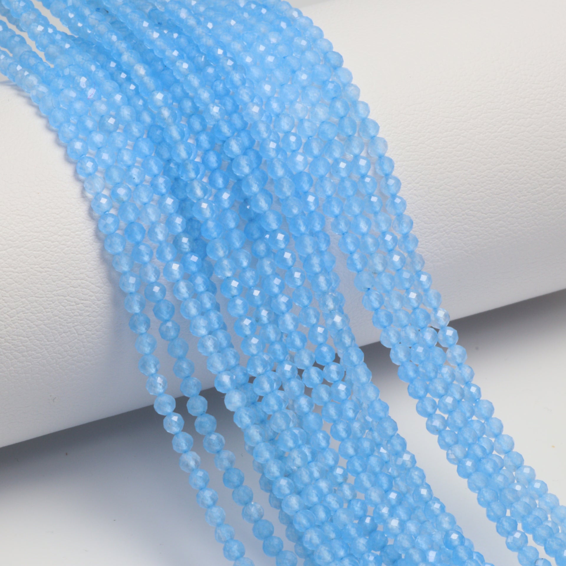 Discover the enchanting allure of our 13" Full Bead Strand of Blue Chalcedony (D) Faceted Rounds. These 2.5mm beads are meticulously crafted to showcase the captivating hues and shimmering facets of the blue chalcedony gemstone. Ideal for jewelry designers and stores, these beads offer a unique blend of elegance and versatility. Whether you're creating a statement necklace or a delicate bracelet, these beads will add a touch of sophistication and charm to any design. As a gemstone wholesaler, we ensure that each bead is of the highest quality, promising a product that not only meets but exceeds your expectations. Elevate your jewelry designs with the mesmerizing beauty of our blue chalcedony faceted round beads.