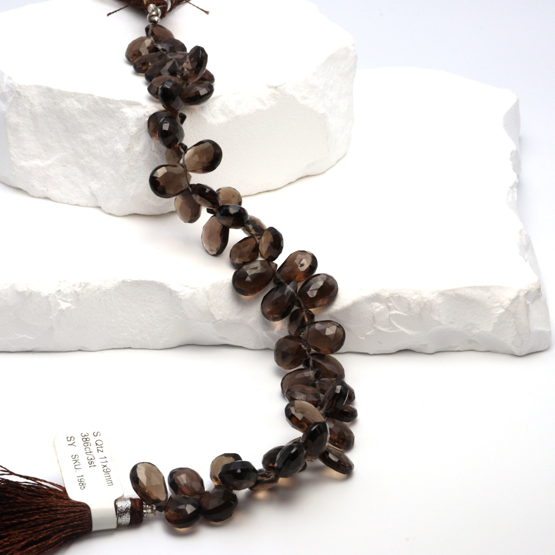 Discover the allure of our 8" Full Bead Strand of Brown Smoky Quartz Faceted Pear Shaped Briolettes. Each 11x9mm bead is meticulously crafted, showcasing the unique beauty of smoky quartz. This strand features a rich, earthy brown hue that adds a touch of elegance and sophistication to any jewelry design. Perfect for jewelry designers and stores, these gemstone beads are not only visually stunning but also durable and long-lasting. The faceted pear shape of the briolettes enhances their sparkle, making them a captivating choice for creating exquisite necklaces, bracelets, or earrings. Add these smoky quartz beads to your collection and let your creativity shine.