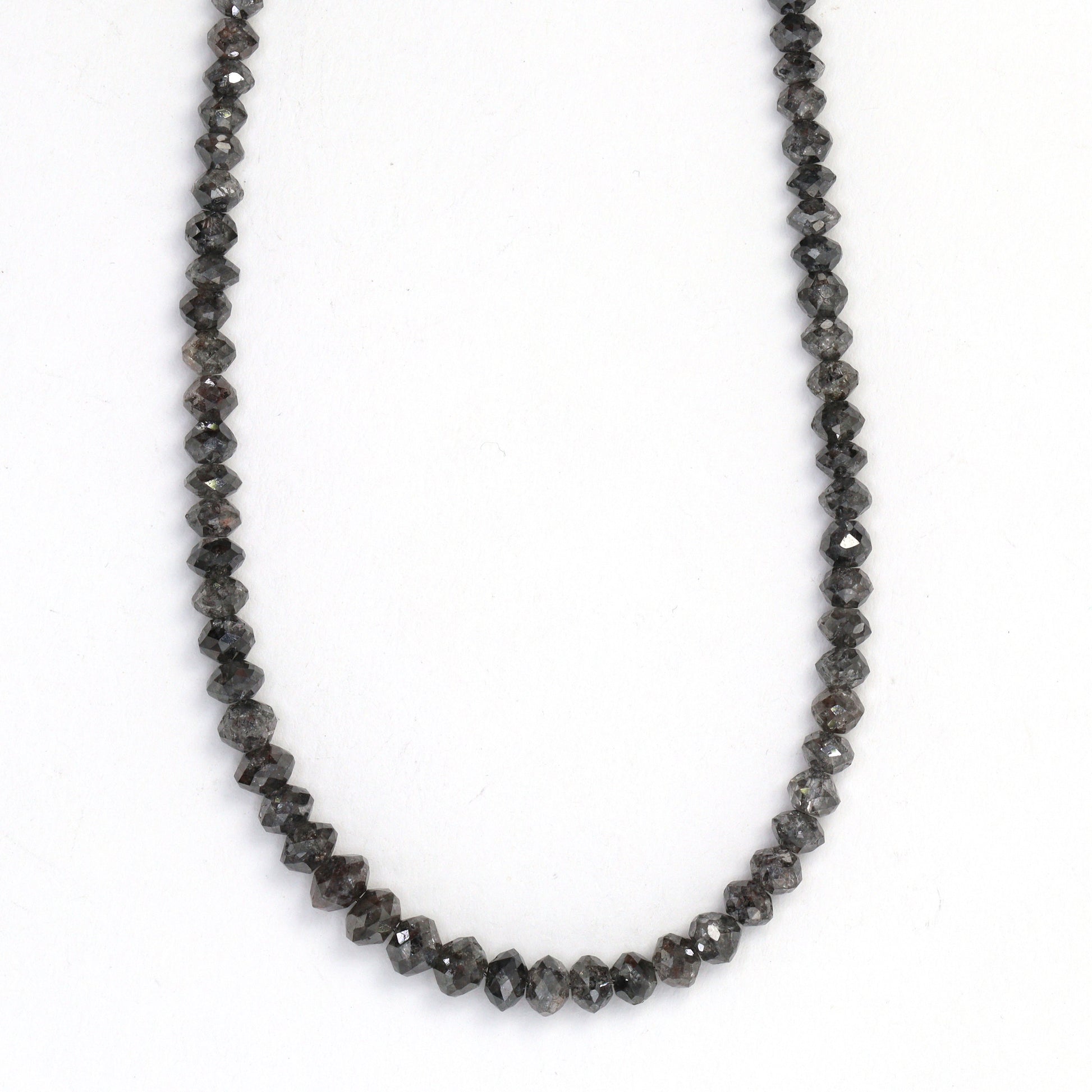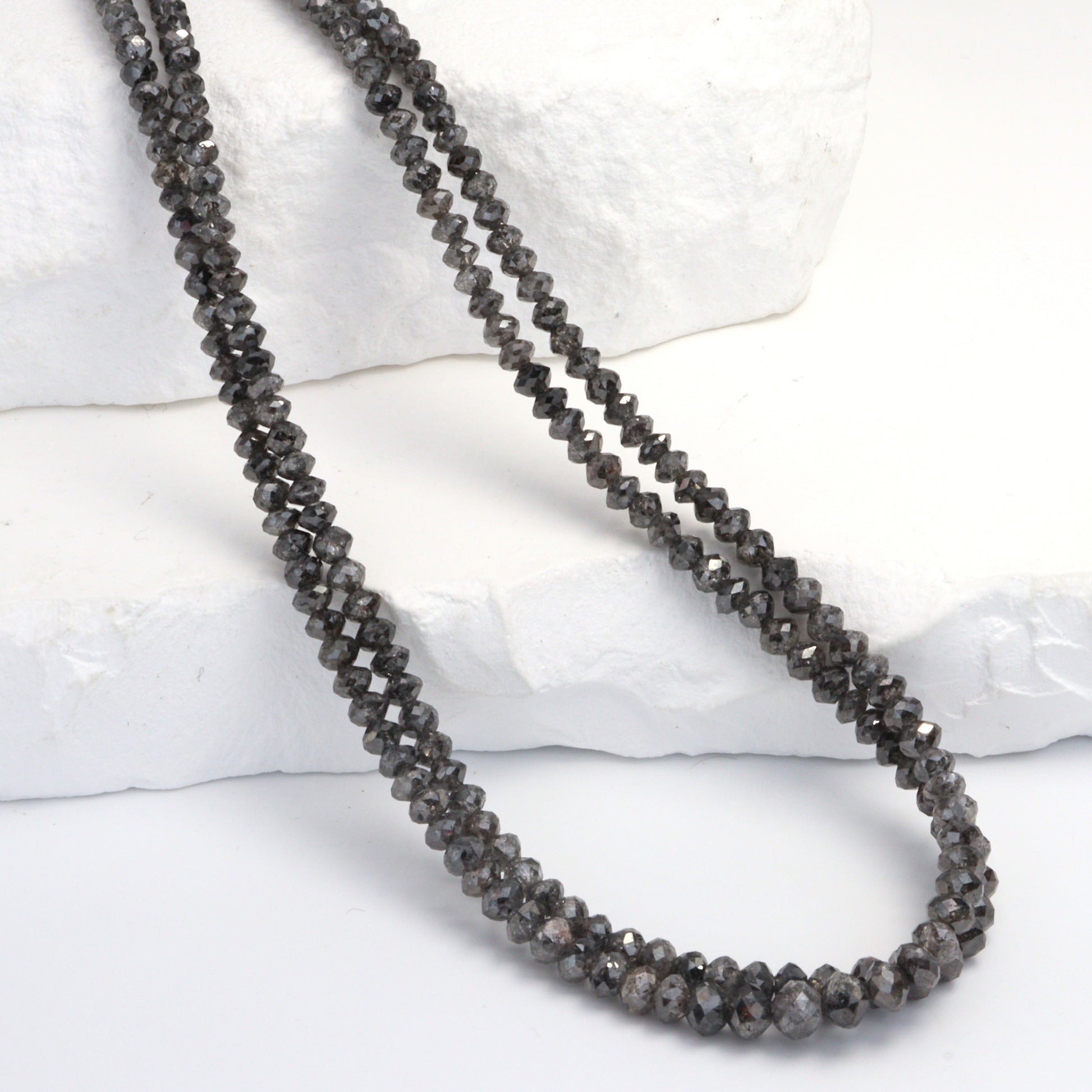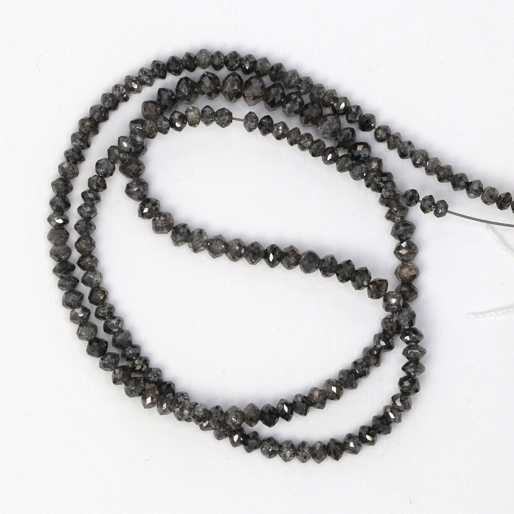 Elevate your jewelry collection with the sophisticated allure of our Gray Diamond 2.5mm - 4mm Hand Faceted Rondelle Beads. Each bead on this luxurious strand is a testament to exquisite craftsmanship, hand-faceted to perfection, showcasing the unique and subtle elegance of gray diamonds. Ranging from 2.5mm to 4mm, these rondelles present a versatile size spectrum, making them ideal for a variety of jewelry designs, from delicate bracelets to statement necklaces. The nuanced shades of gray in these diamonds offer a contemporary and versatile alternative to traditional diamond colors, lending a modern edge to any piece. Gray diamonds are renowned not only for their rare beauty but also for symbolizing stability and dependability, adding a meaningful depth to your creations. This strand is perfect for designers and jewelers who seek to offer their clients something truly unique and of the highest quality. The Gray Diamond Hand Faceted Rondelle Beads are an exceptional choice for those who value sophisticated, timeless elegance combined with a touch of modern luxury.