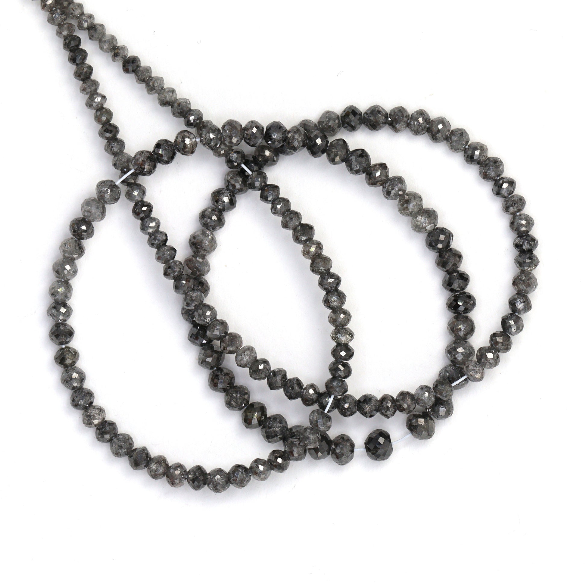 Elevate your jewelry designs with the sophisticated allure of our Gray Diamond Faceted Rondelle Beads, ranging from 2.5mm to 4mm in size. This luxurious strand features a stunning array of gray diamonds, each bead meticulously faceted to showcase the diamonds' unique brilliance and captivating shades of gray. The subtle variation in size from 2.5mm to 4mm lends a dynamic and modern feel to the strand, perfect for creating high-end, contemporary jewelry pieces. Gray diamonds, celebrated for their elegance and rarity, offer a chic and refined alternative to traditional diamonds, making these beads ideal for designers and jewelers who wish to offer something distinct and trendsetting. These faceted rondelle beads are incredibly versatile, suitable for crafting everything from sleek, minimalist pieces to more intricate, statement designs. Whether used in bracelets, necklaces, or earrings, our Gray Diamond Faceted Rondelle Beads promise to infuse your creations with a touch of luxury, sophistication, and a modern edge, appealing to a discerning clientele seeking exceptional quality and unique beauty in their jewelry.