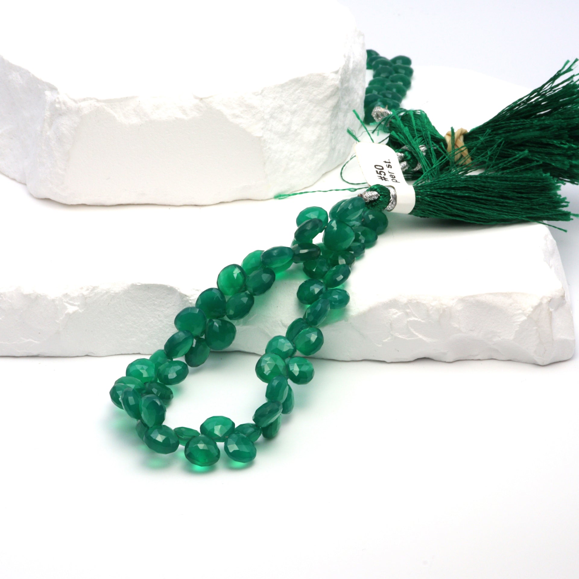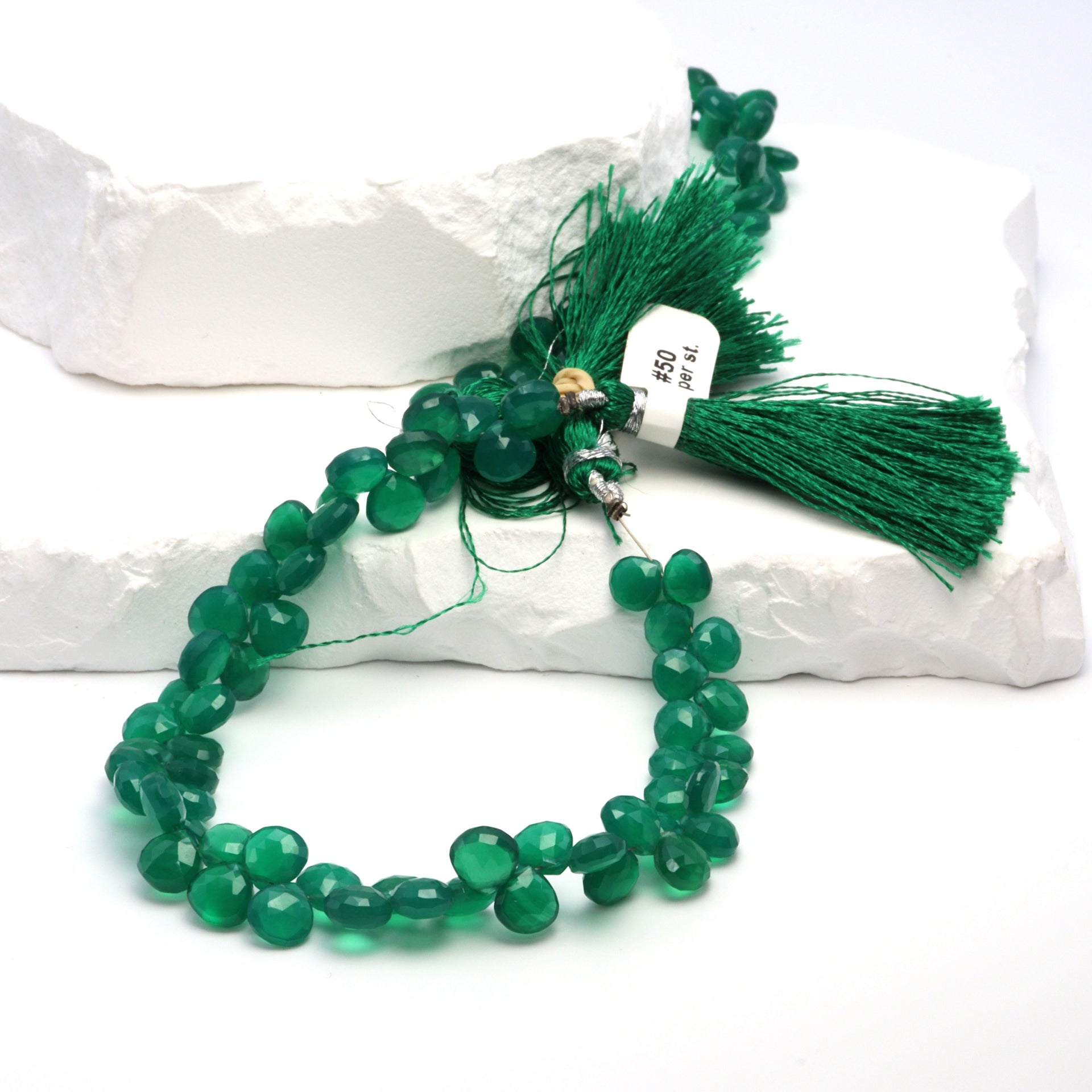 Discover the exquisite beauty of our 8" Full Bead Strand of Green Onyx Faceted Heart Shaped Briolettes. These 6mm beads are meticulously crafted to showcase the unique allure of green onyx, a gemstone renowned for its rich, verdant hue and mesmerizing depth. Each bead is faceted to enhance its natural sparkle, and shaped into a delicate heart for a touch of romantic elegance. Ideal for jewelry designers and stores, these green onyx beads can transform any jewelry piece into a stunning work of art. Whether you're creating a statement necklace or a simple bracelet, these beads will add a luxurious touch to your designs. Experience the quality and beauty of our wholesale gemstones today.