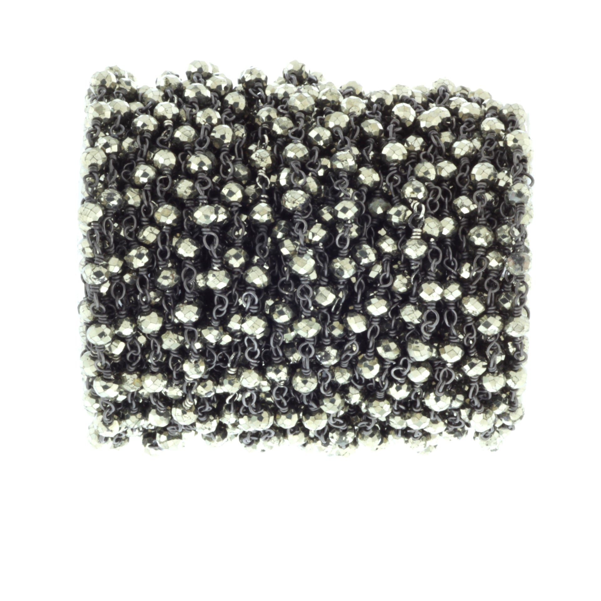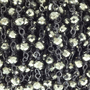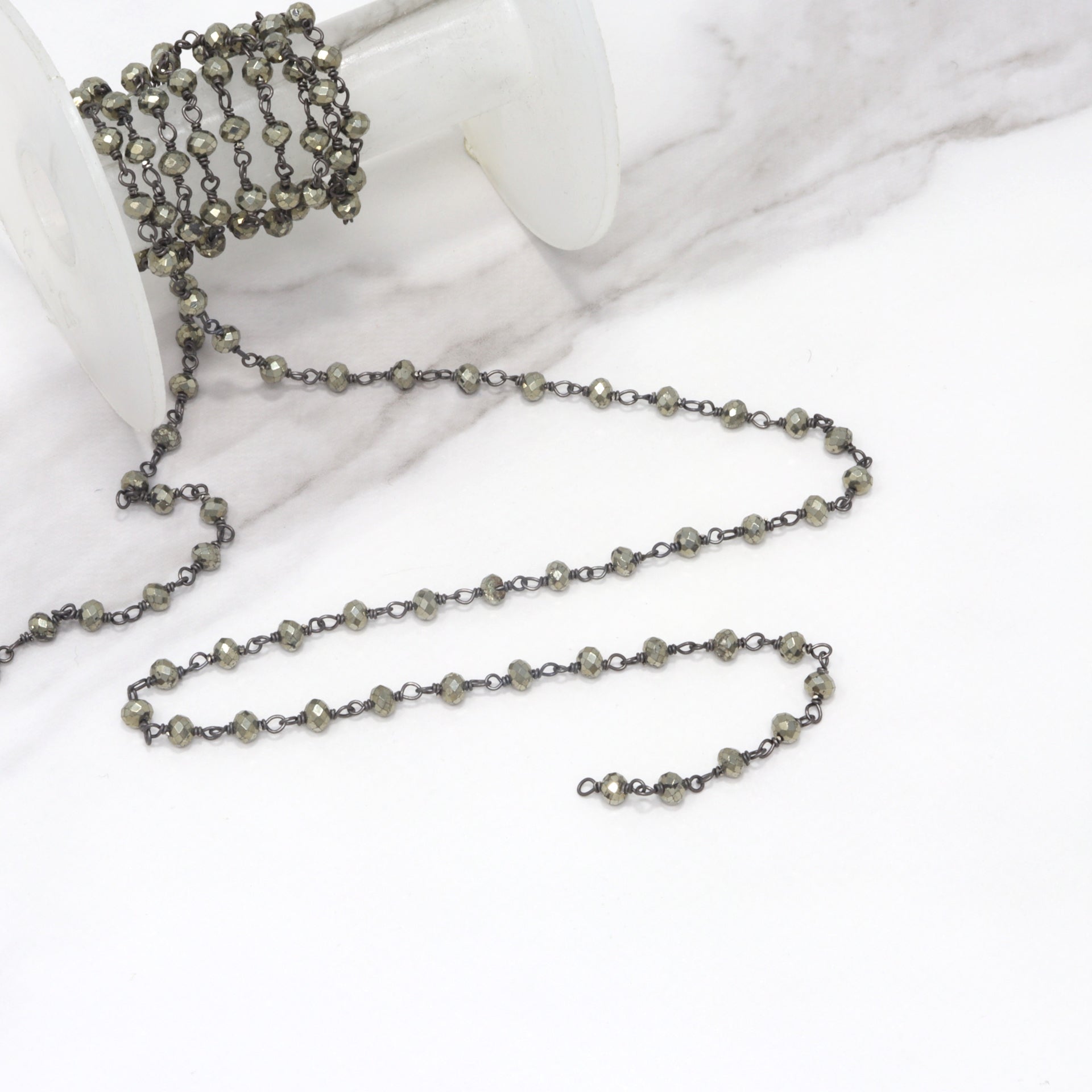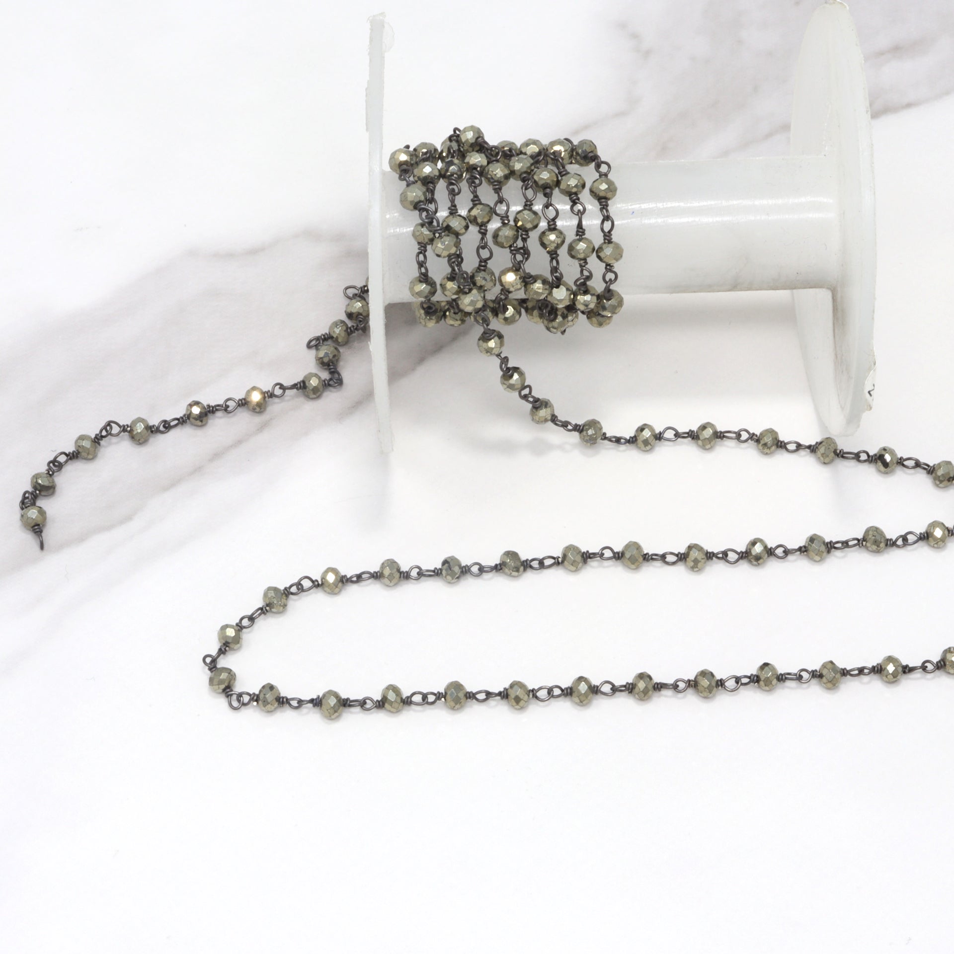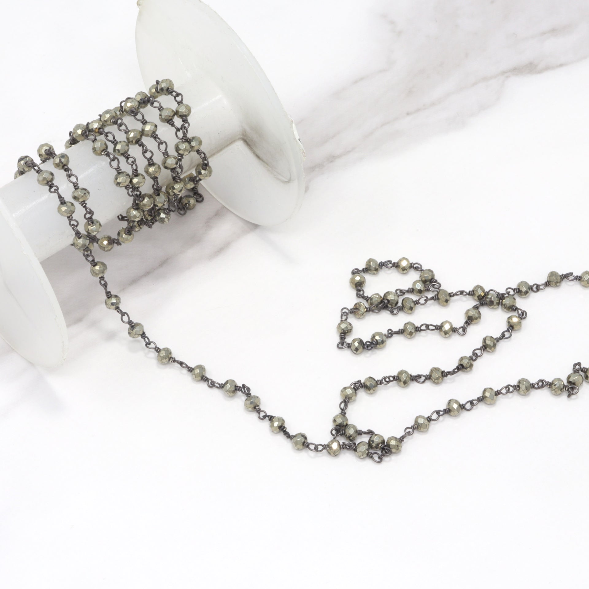 Natural Pyrite 4mm Faceted Rondelles Rosary Chain Sterling Silver with Black Rhodium Plating Wire Wrap Chain by the Foot