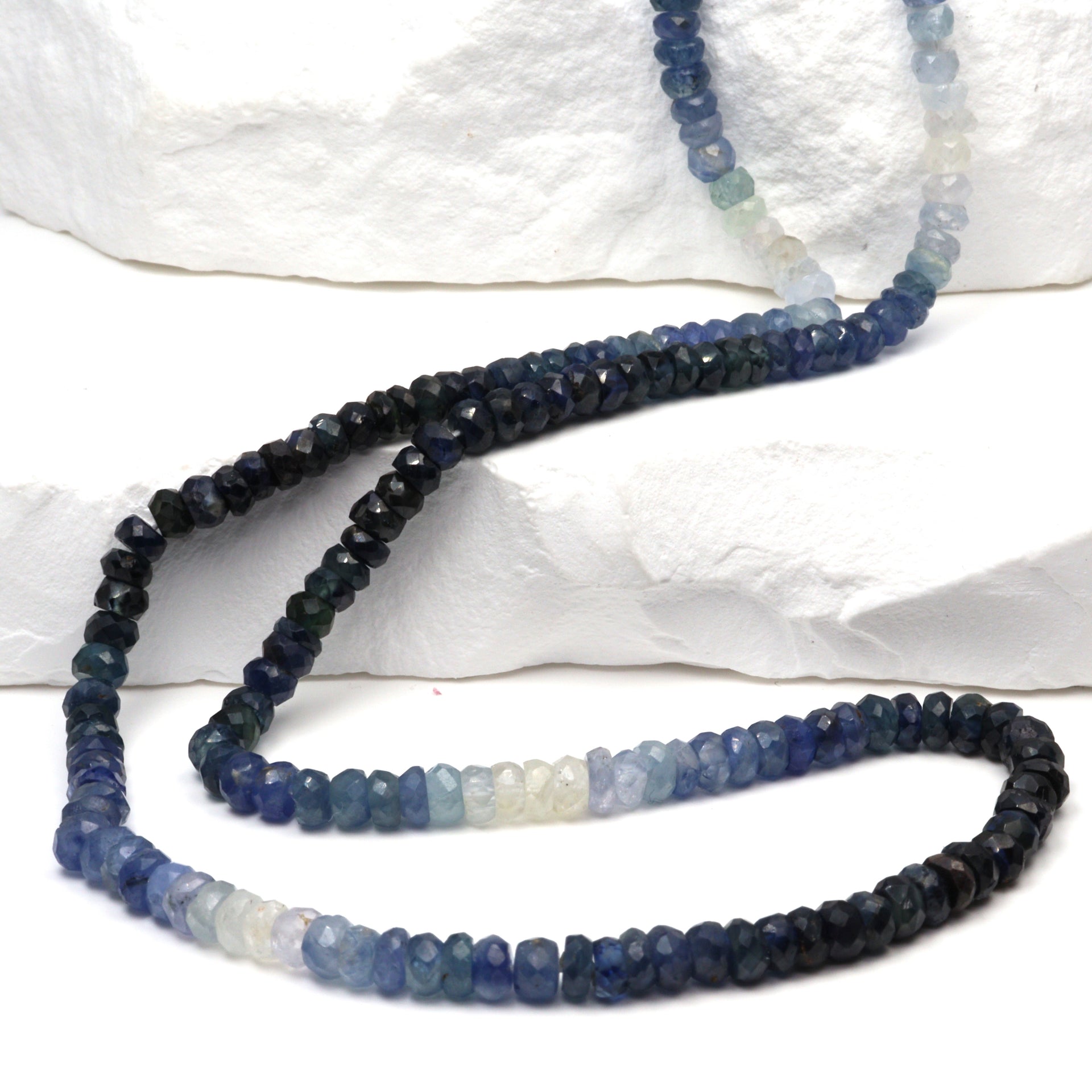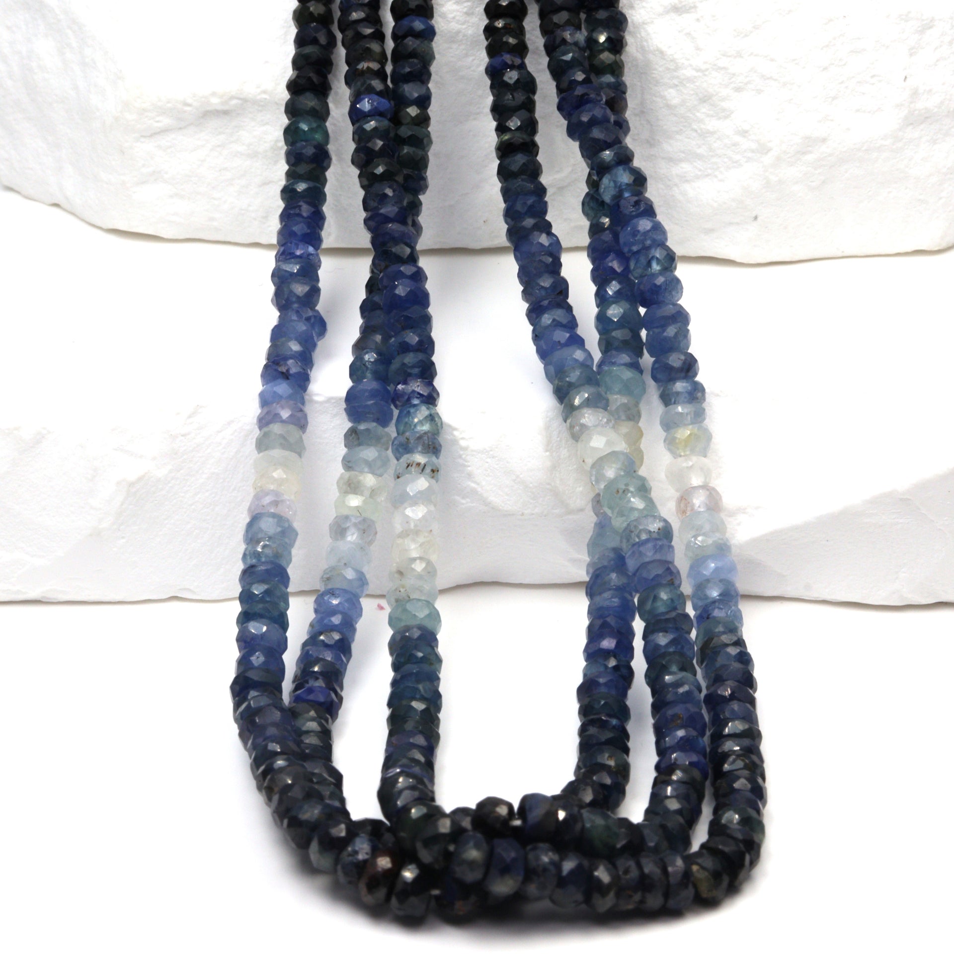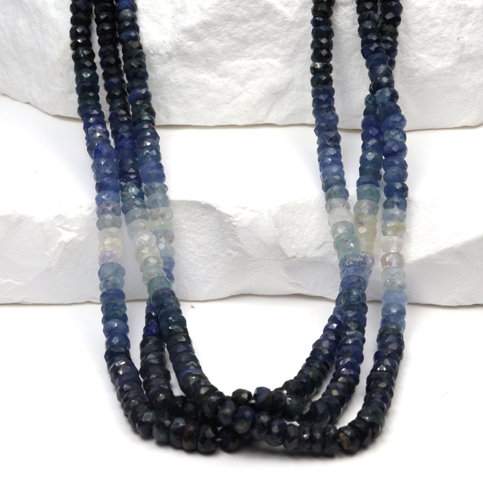 Discover the enchanting allure of our 16" Full Bead Strand of Ombre Blue and White Sapphire Faceted Rondelles. These exquisite 4mm beads are meticulously crafted, showcasing a captivating gradient from deep blue to pristine white. As a gemstone wholesaler, we provide these high-quality sapphire beads that are perfect for creating unique, luxurious jewelry pieces. Their faceted rondelle shape enhances their sparkle, catching the light beautifully. Ideal for jewelry designers and stores, these sapphire beads offer a touch of elegance and sophistication to any design. Add a splash of color and a dash of charm to your jewelry collection with our Ombre Blue and White Sapphire Faceted Rondelles.