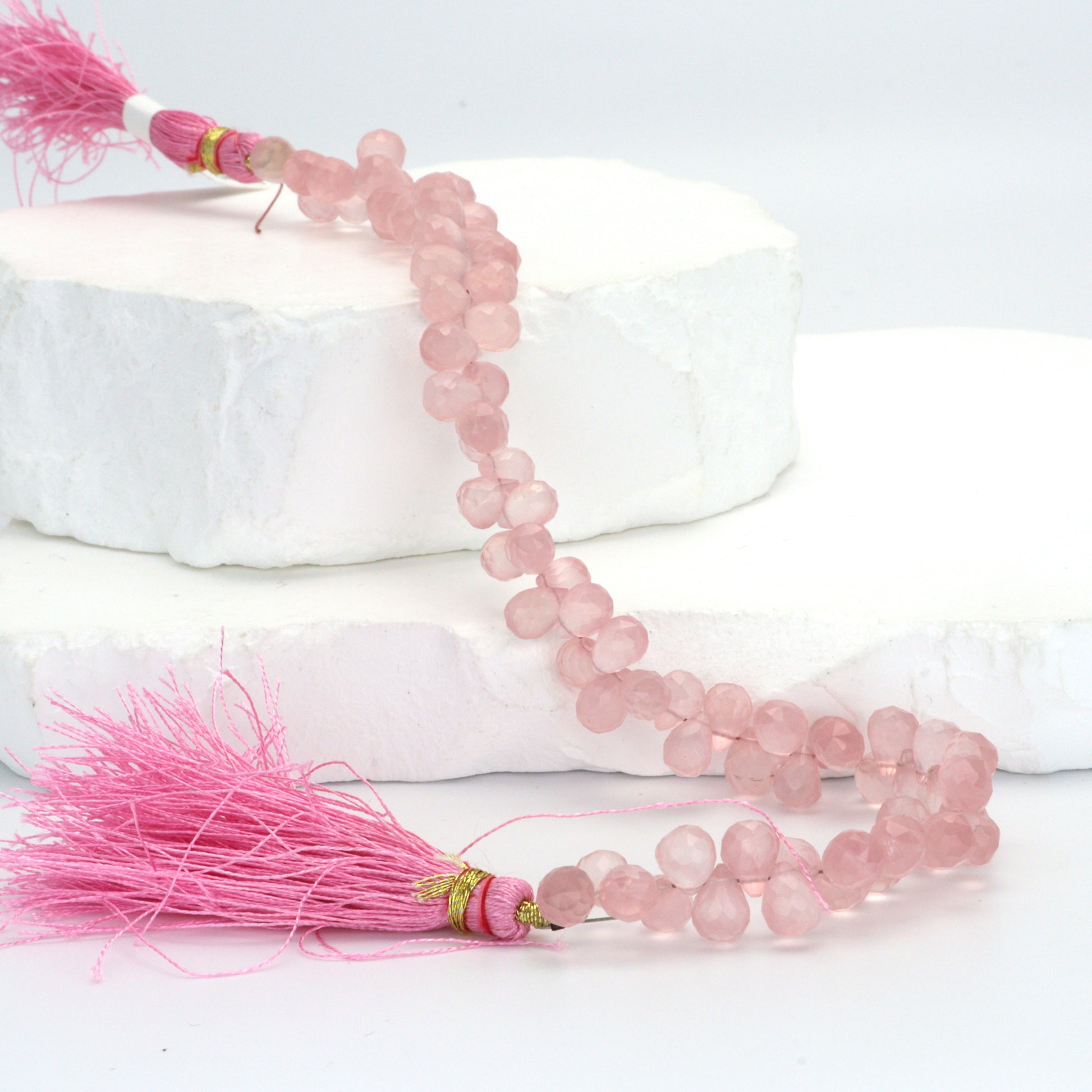 Elevate your jewelry designs with the romantic elegance of our Rose Quartz 7x5mm Faceted Teardrop Briolette Beads. Each strand of this enchanting collection features delicate teardrop-shaped beads, meticulously faceted to showcase the soft, translucent pink of rose quartz, often referred to as the stone of love. These 7x5mm briolettes are expertly shaped, ensuring each bead catches and reflects light, creating a gentle yet captivating glow. The unique teardrop shape makes these beads ideal for creating sophisticated earrings, charming pendants, or as accents in luxurious necklaces and bracelets. Rose quartz is not just celebrated for its alluring aesthetic; it's also revered for its symbolic properties of compassion and peace, infusing your designs with a sense of harmony and emotional healing. For designers and jewelers looking to captivate their customers with pieces that exude grace, serenity, and heartfelt beauty, our Rose Quartz Faceted Teardrop Briolette Beads are an impeccable choice, adding a touch of elegance and timeless charm to any jewelry collection.