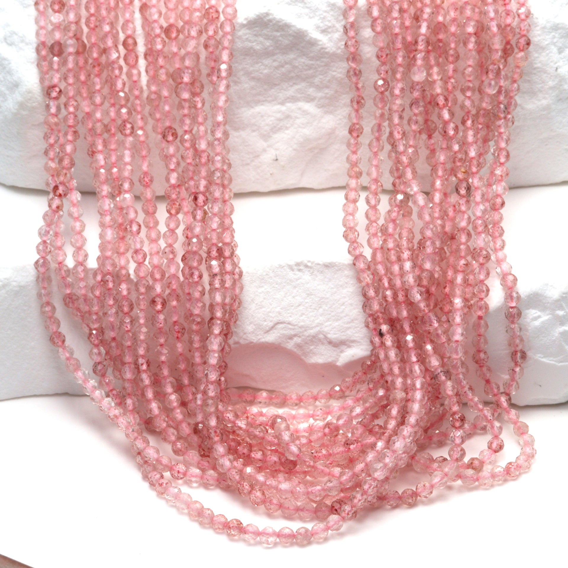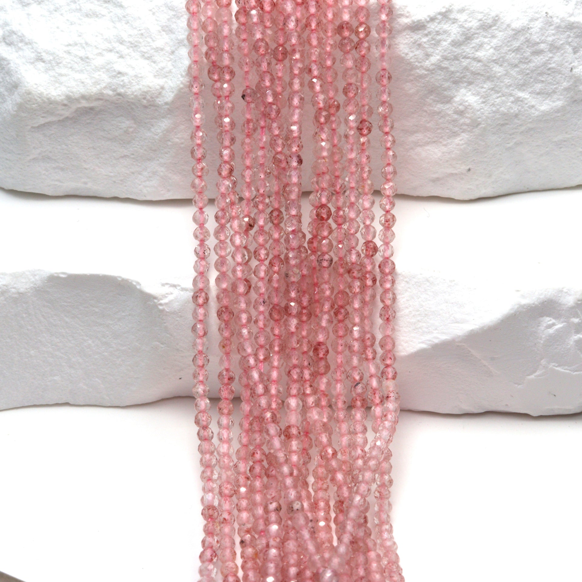 Discover the exquisite beauty of our 13" Full Bead Strand of Pink Strawberry Quartz Faceted Rounds. These 2mm beads are meticulously crafted to showcase the unique charm of strawberry quartz, a gemstone renowned for its captivating pink hue and sparkling inclusions. As a gemstone wholesaler, we provide these high-quality beads in bulk, making them an ideal choice for jewelry designers and stores looking to create stunning pieces. Each bead is faceted, enhancing its natural brilliance and making it a standout choice for any jewelry design. Whether you're crafting a delicate bracelet or a statement necklace, these pink strawberry quartz beads will add a touch of elegance and sophistication to your creations.
