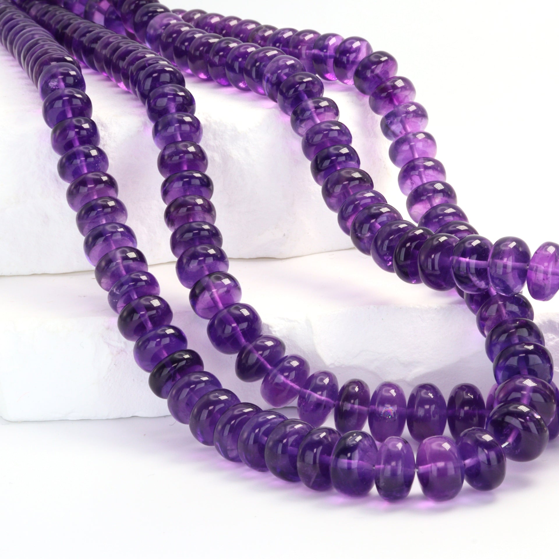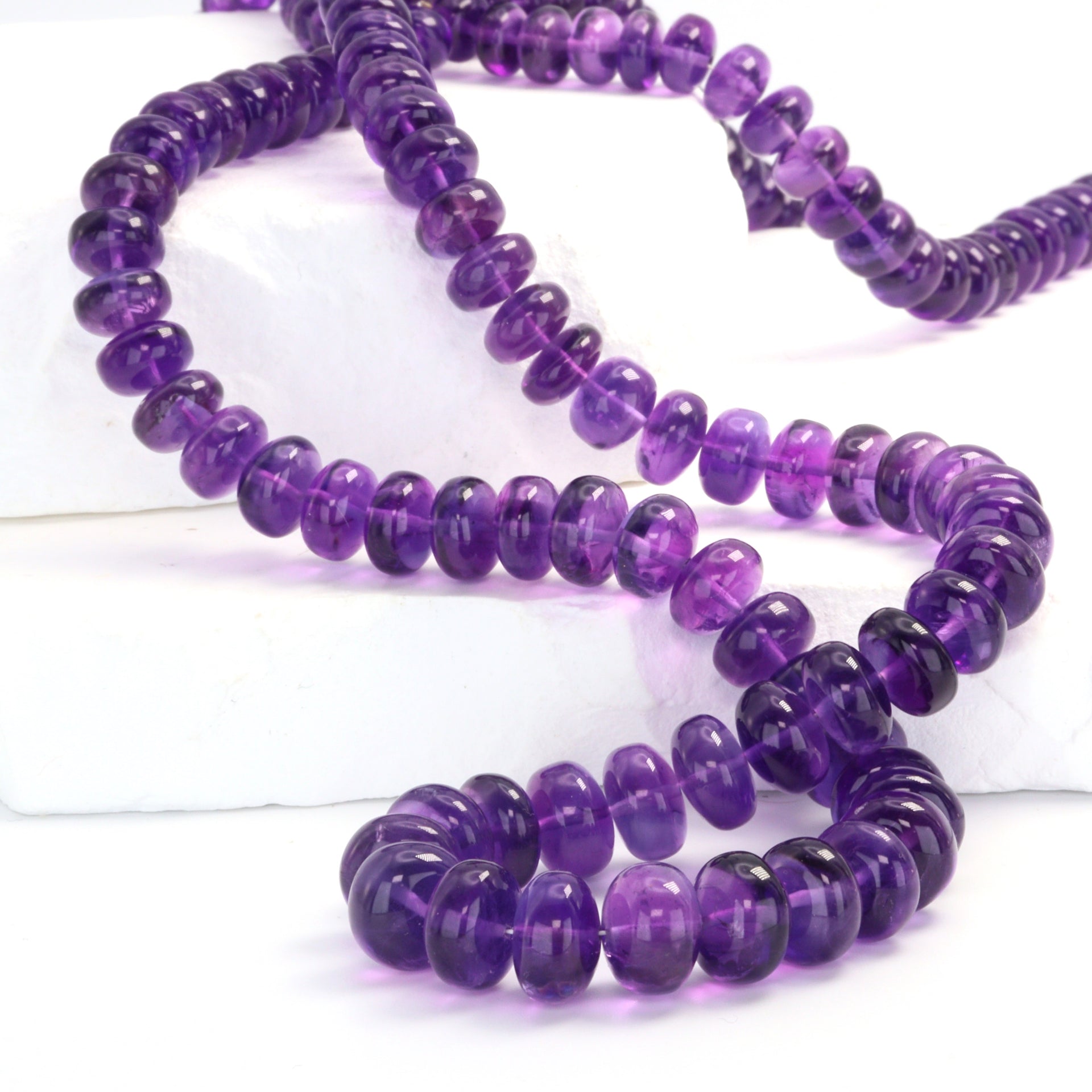 Immerse your clientele in the world of regal elegance with our Purple Amethyst 6-10mm Smooth Rondelle Beads. This luxurious strand showcases the royal beauty of amethyst, ranging in size from 6mm to 10mm, perfect for creating a graduated effect in your designs. Each bead is polished to a smooth finish, revealing the deep, enchanting purple hues that amethyst is celebrated for. The gentle rondelle shape enhances the gemstone's natural luster and richness, making these beads ideal for crafting sophisticated necklaces, elegant bracelets, or statement earrings. Known for its calming properties and often associated with creativity and spiritual growth, purple amethyst adds not only visual splendor but also a touch of tranquility and inspiration to your jewelry. For designers and stores aiming to offer pieces that blend timeless elegance with contemporary style, our Purple Amethyst Smooth Rondelle Beads are a must-have. They promise to bring a touch of luxury and artistic flair to any collection, appealing to those who cherish both beauty and meaning in their jewelry.