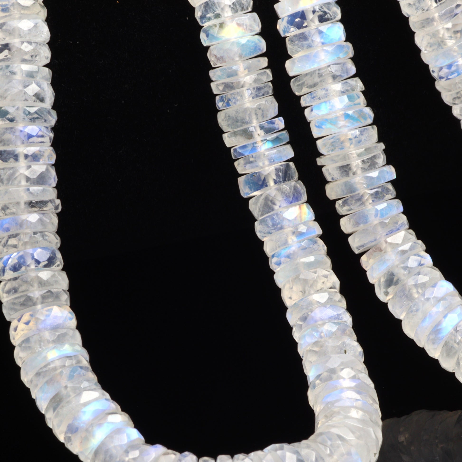 Illuminate your jewelry designs with the ethereal beauty of our Blue Rainbow Moonstone 7mm Faceted Tire Shaped Beads, a celestial treasure for designers and retailers. Each bead in this remarkable strand is a 7mm tire-shaped gem, expertly faceted to enhance the moonstone's natural adularescence. The unique tire shape adds a modern twist to the classic allure, making these beads perfect for contemporary designs. The blue rainbow moonstone, known for its dreamy play of color, displays captivating flashes of blue light, reminiscent of moonbeams dancing on a serene night. These beads are perfect for creating statement pieces or adding a touch of mystique to any design, be it bracelets, necklaces, or earrings. Beyond its mesmerizing appearance, moonstone is cherished for symbolizing inner growth and strength, adding a layer of meaning to your creations. For those seeking to offer jewelry that combines innovation, elegance, and a hint of magic, our Blue Rainbow Moonstone Faceted Tire Shaped Beads are an exquisite choice, promising to enchant your clientele with their unique beauty and exceptional quality.