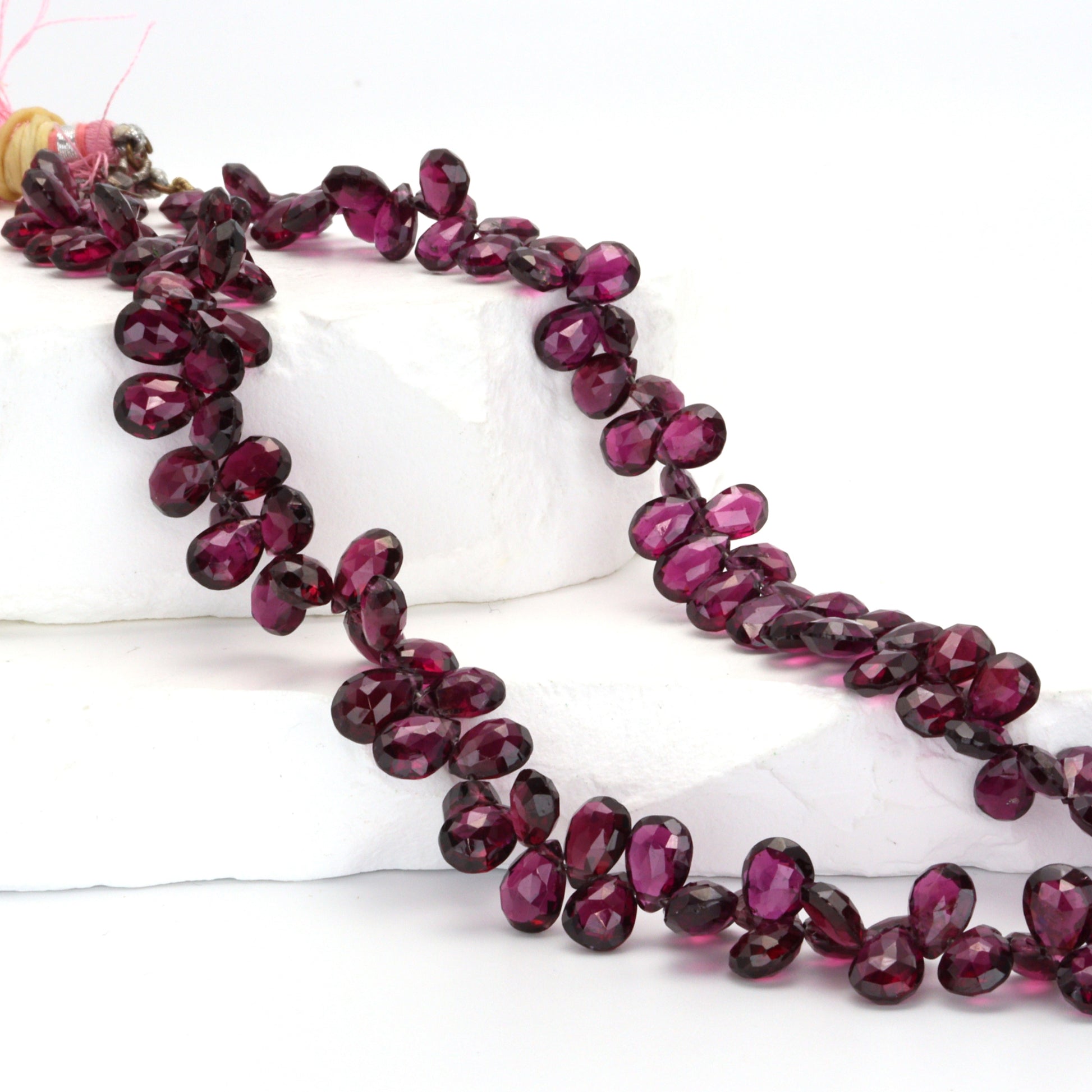 Discover the exquisite beauty of our 8" Full Bead Strand of AAA Rhodolite Garnet Faceted Pear Shaped Briolettes. These premium 8x6mm beads are meticulously crafted to showcase the rich, raspberry-red hues of AAA quality Rhodolite Garnet. Each bead is faceted to perfection, ensuring maximum sparkle and brilliance. Ideal for creating stunning jewelry pieces, these garnet beads offer a unique blend of elegance and sophistication. As a trusted gemstone wholesaler, we provide only the finest quality gemstone beads to jewelry designers and stores. Elevate your jewelry designs with the captivating allure of our Rhodolite Garnet Briolettes.