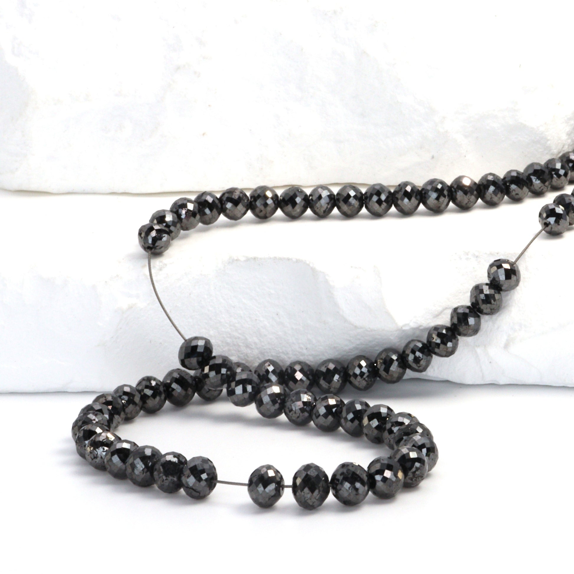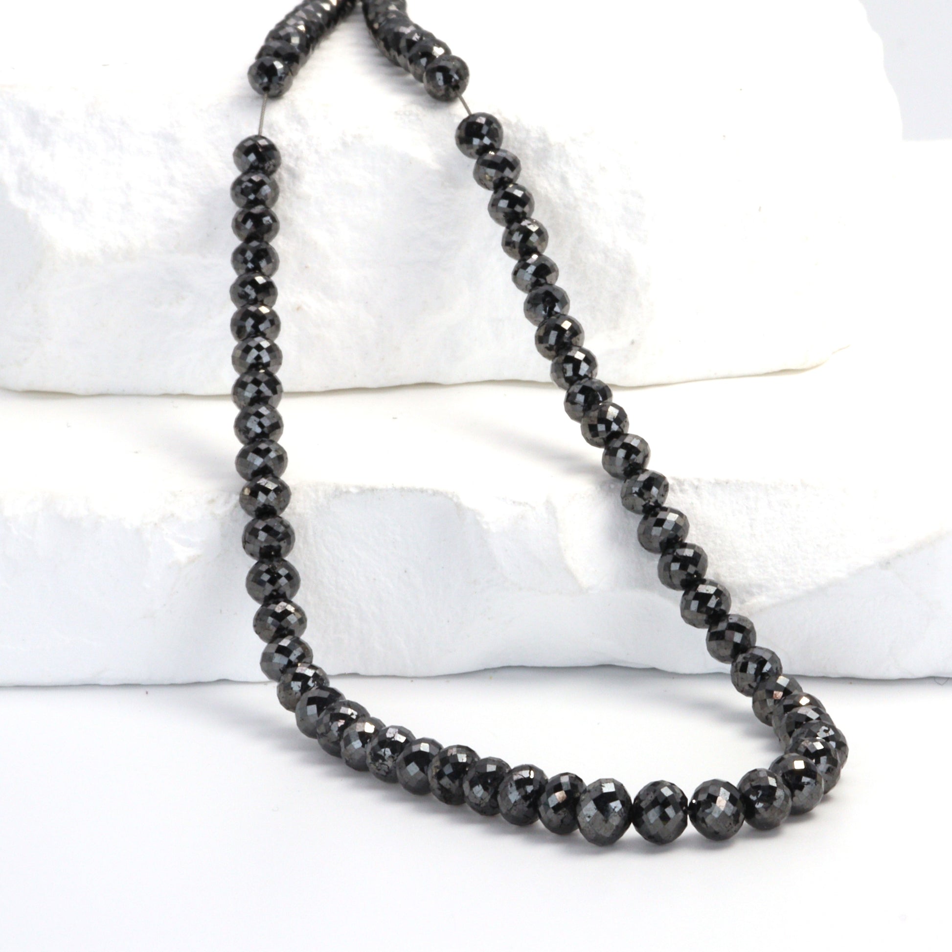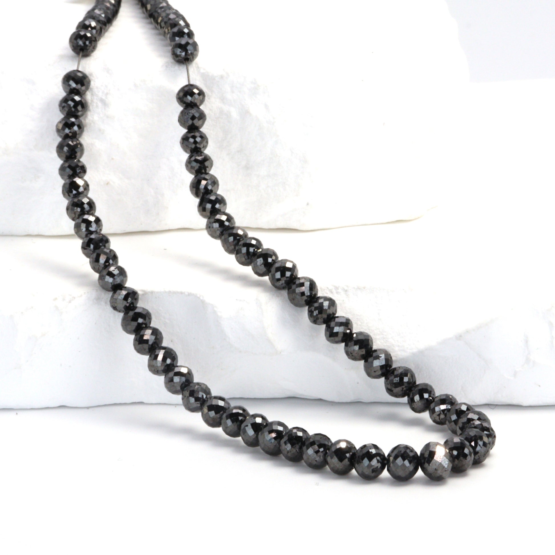 Elevate your jewelry designs to new heights of luxury with our Black Diamond 4.5mm - 5.0mm Faceted Rondelle Beads, a statement choice for designers and retailers seeking to infuse their collections with unmatched elegance and sophistication. Each bead in this exclusive strand exudes opulence, with the unique allure of black diamonds that captivate with their mysterious shimmer and intense depth. The precise faceting of these 4.5mm to 5.0mm rondelles enhances their natural brilliance, ensuring they catch the light in a way that is both subtle and dramatic. Perfect for creating high-end, contemporary jewelry pieces, these beads offer a modern twist on classic elegance, making them ideal for luxurious necklaces, bracelets, and statement earrings. Black diamonds are renowned not only for their bold beauty but also for symbolizing strength and eternal love, adding a layer of meaning to your designs. For those dedicated to offering their clientele the epitome of style and sophistication, our Black Diamond Faceted Rondelle Beads are the ultimate choice, promising to transform any piece into a masterpiece of design and luxury.