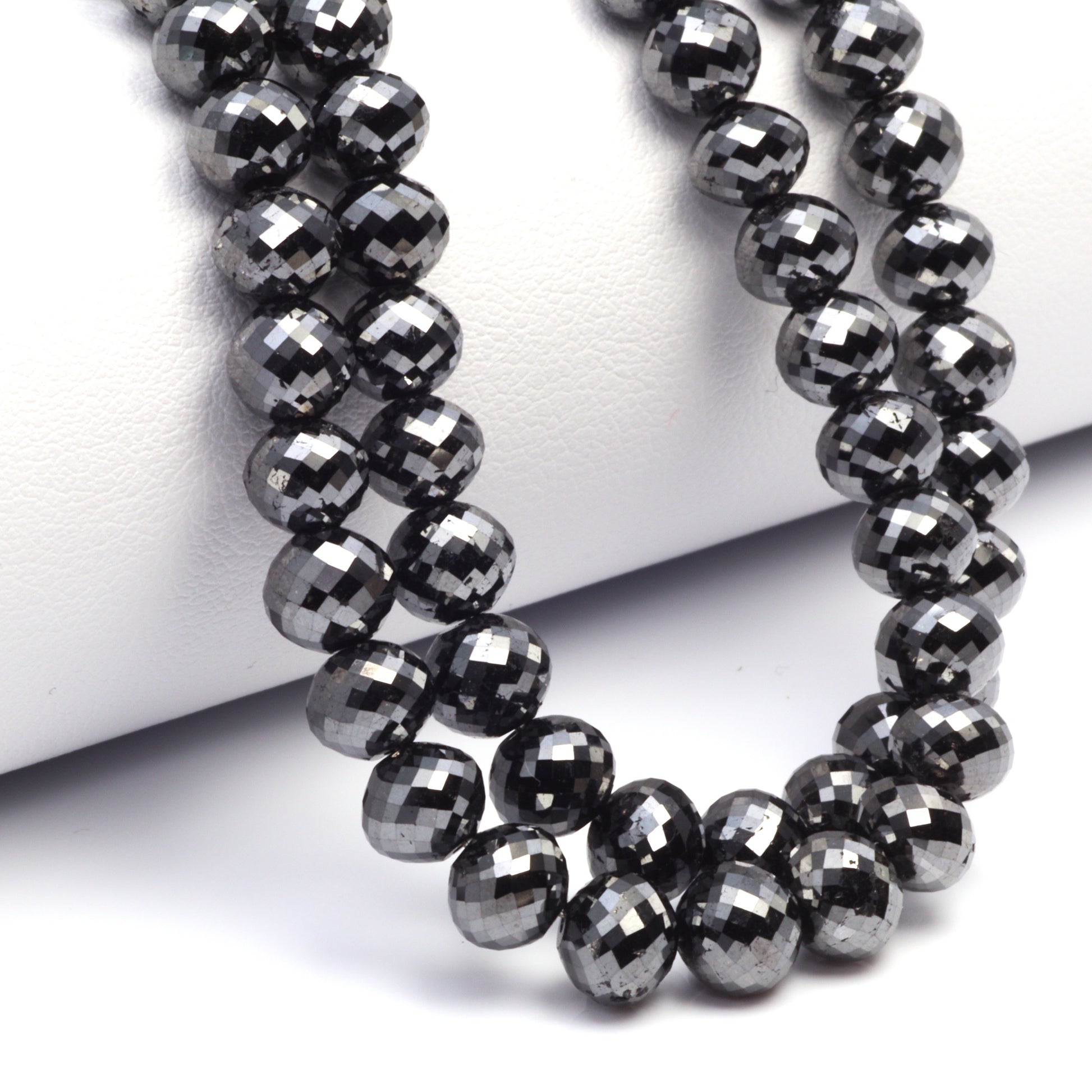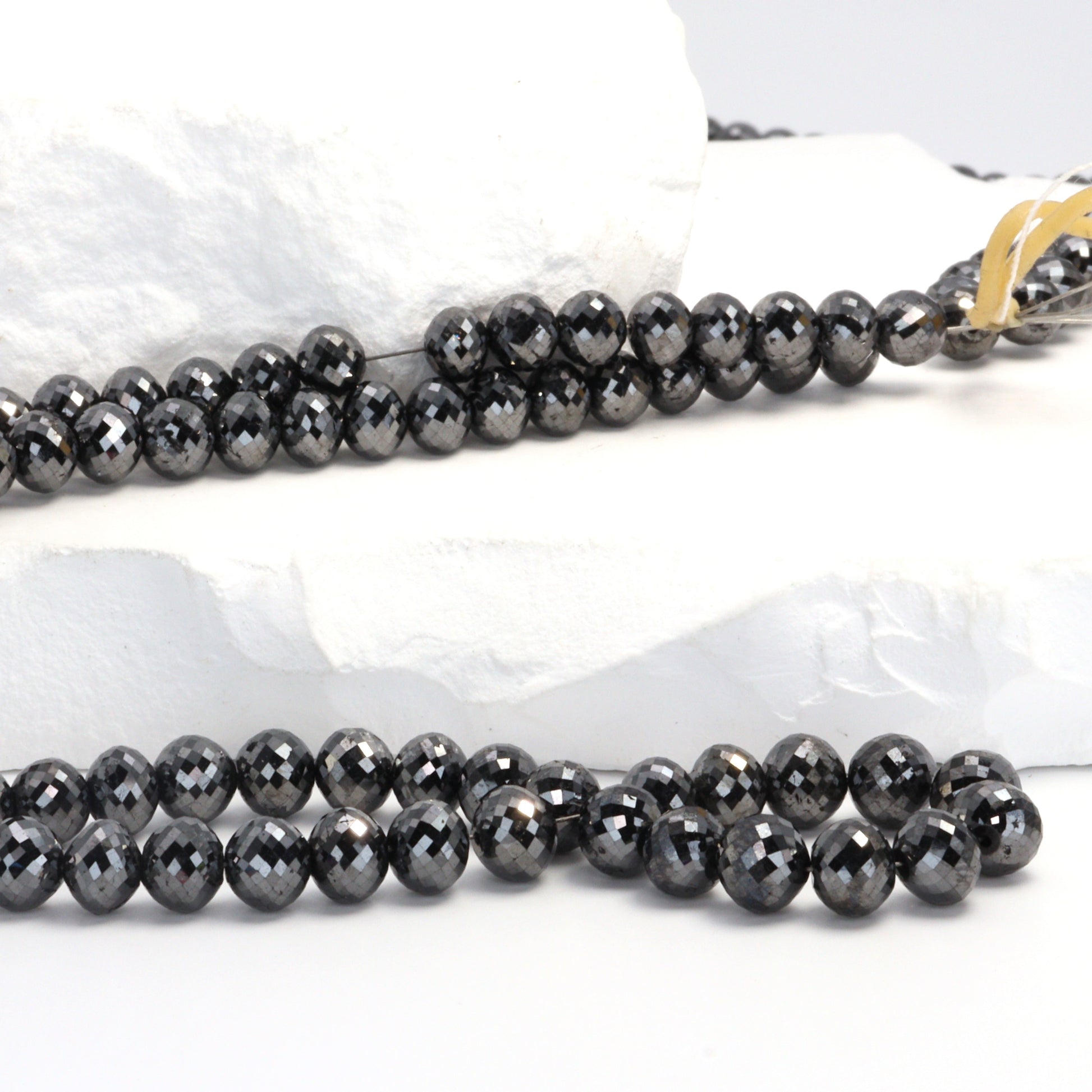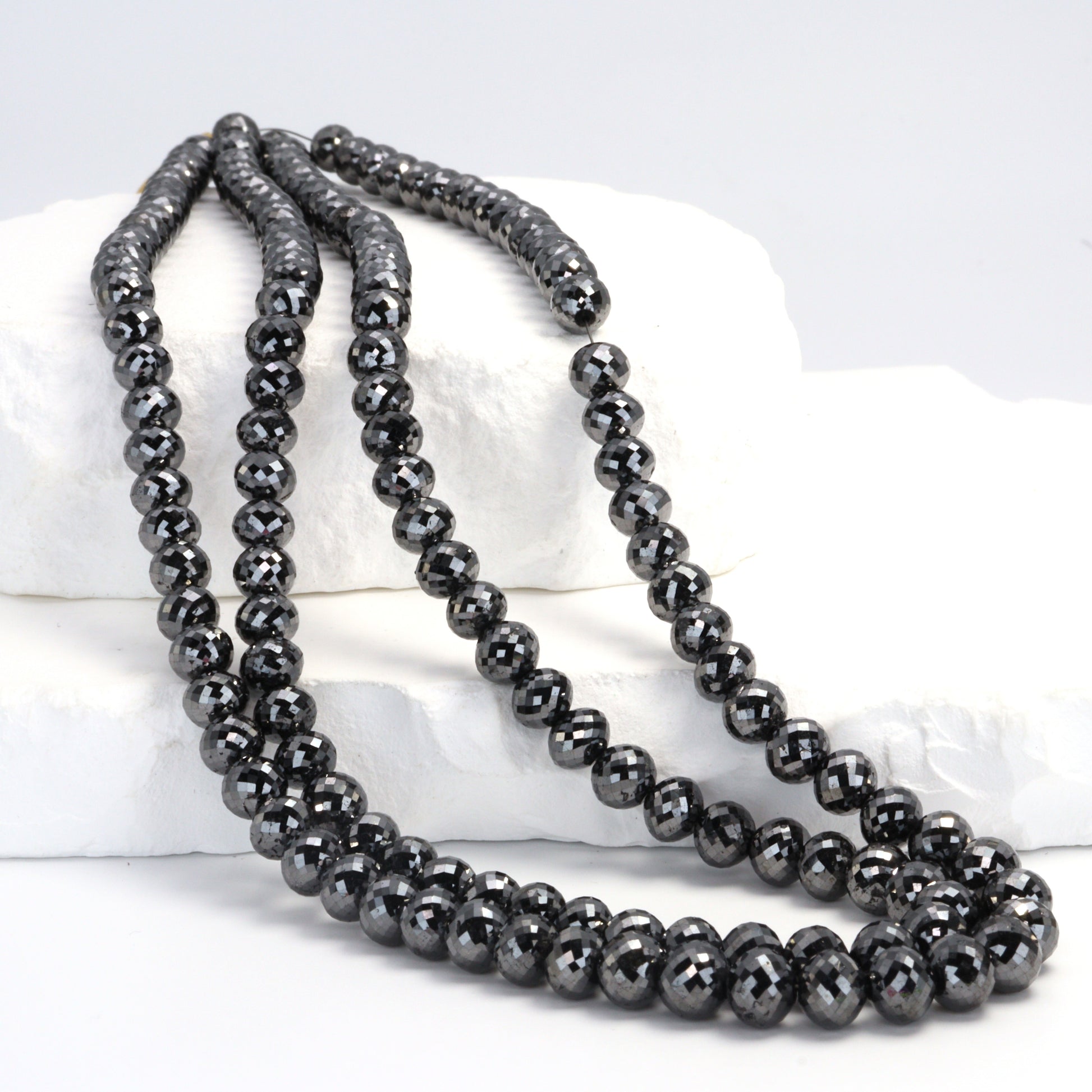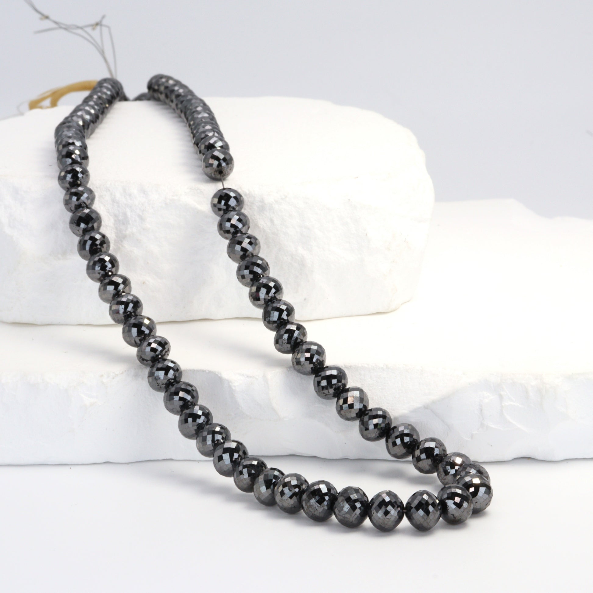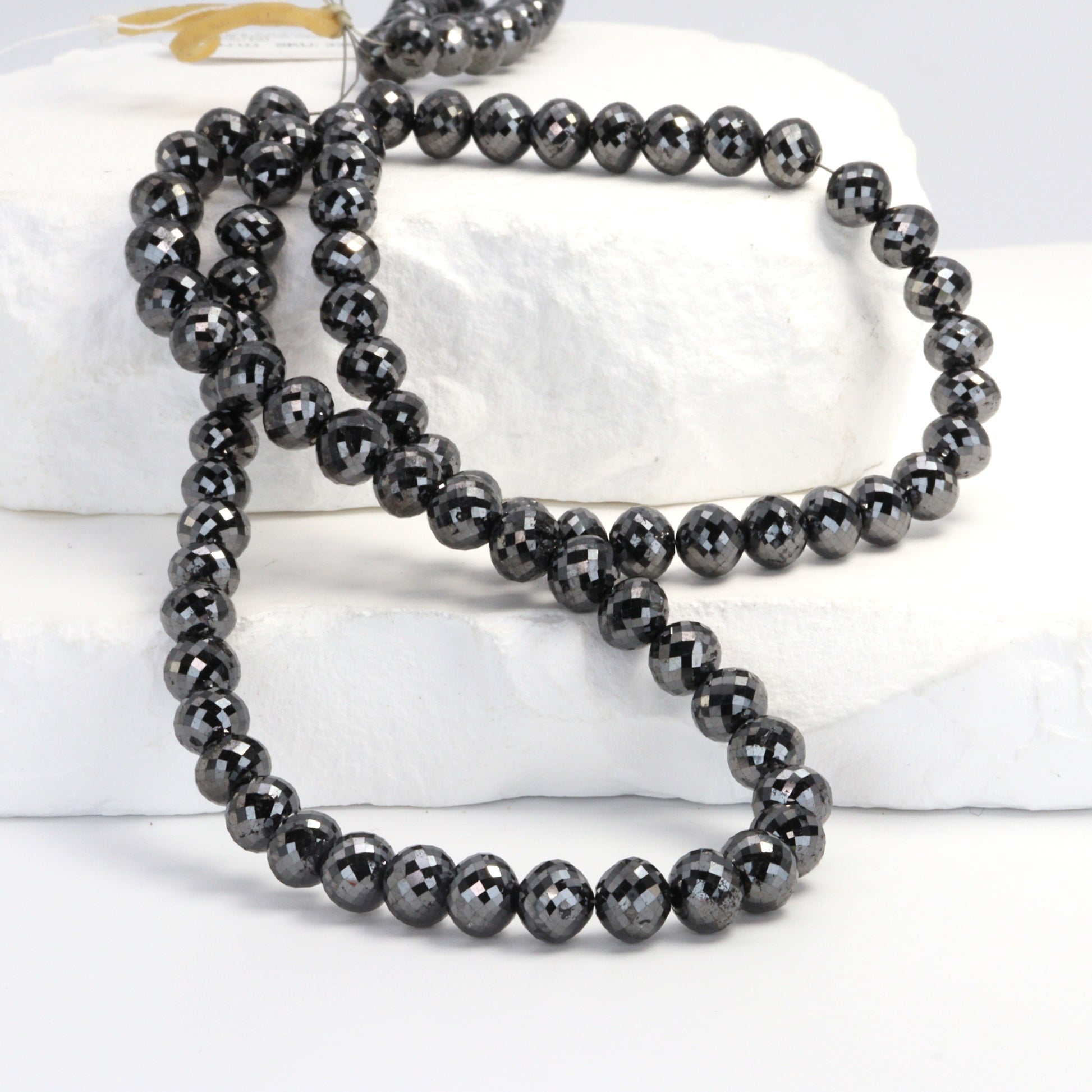 Elevate your jewelry collection with our exquisite strand of Black Diamond Faceted Ball Cut Rondelle Beads, sized between 6mm and 6.8mm. Each bead in this premium strand is a testament to fine craftsmanship, featuring a unique ball cut that enhances the black diamond's natural brilliance and mystique. These faceted rondelles catch the light in a way that creates an enigmatic shimmer, perfect for designers aiming to craft pieces with a touch of luxury and sophistication. The bold 6mm to 6.8mm size makes these beads ideal for creating statement pieces or adding a dramatic flair to more understated designs. Black diamonds are renowned not just for their striking appearance but also for symbolizing strength and eternal beauty, making these beads a meaningful addition to any jewelry piece. Whether you're designing elegant necklaces, bracelets, or earrings, these Fine Quality Black Diamond Beads offer a blend of contemporary style and timeless allure, ensuring your creations captivate and charm with their exceptional quality and unique elegance.