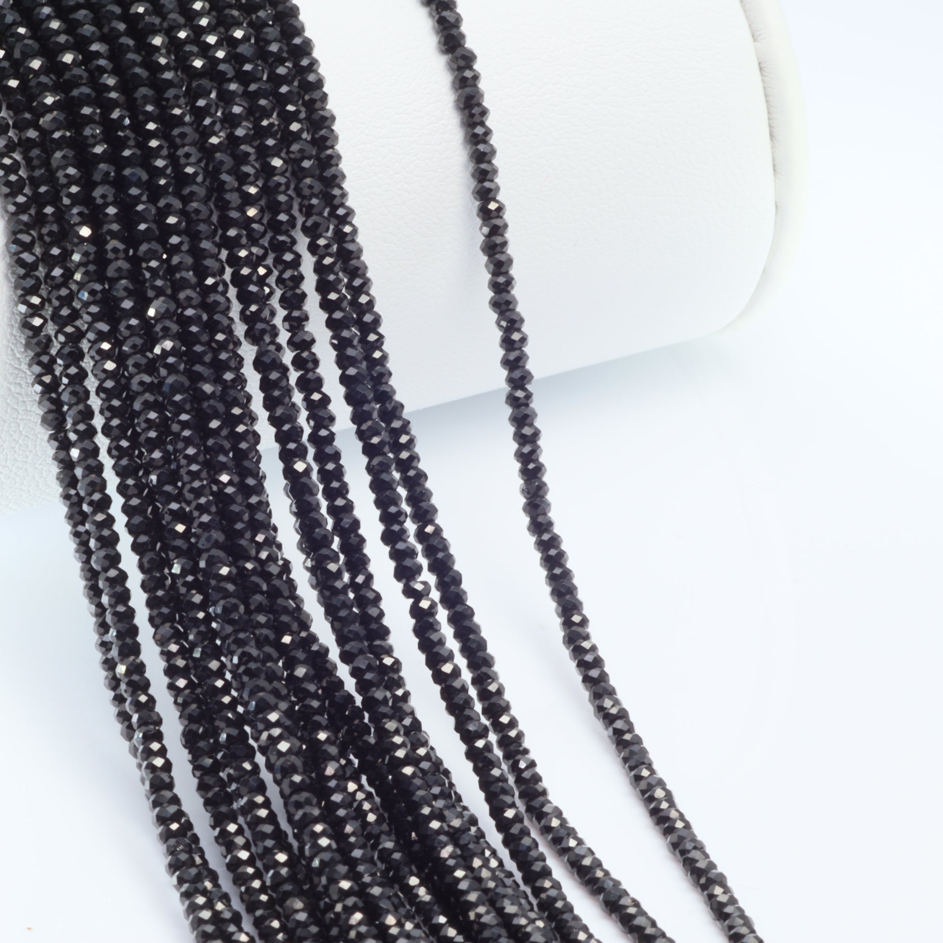 Experience the allure of our 13" Full Bead Strand of Black Spinel Faceted Rondelles. These 2mm beads are meticulously crafted, offering a captivating sparkle that enhances any jewelry design. As a gemstone wholesaler, we provide high-quality, ethically sourced Black Spinel beads that are perfect for creating unique, handcrafted jewelry. Their deep black hue and faceted cut make them a versatile choice for both contemporary and traditional designs. Whether you're a jewelry designer or a jewelry store owner, these Black Spinel Faceted Rondelles will add a touch of elegance and sophistication to your collection.