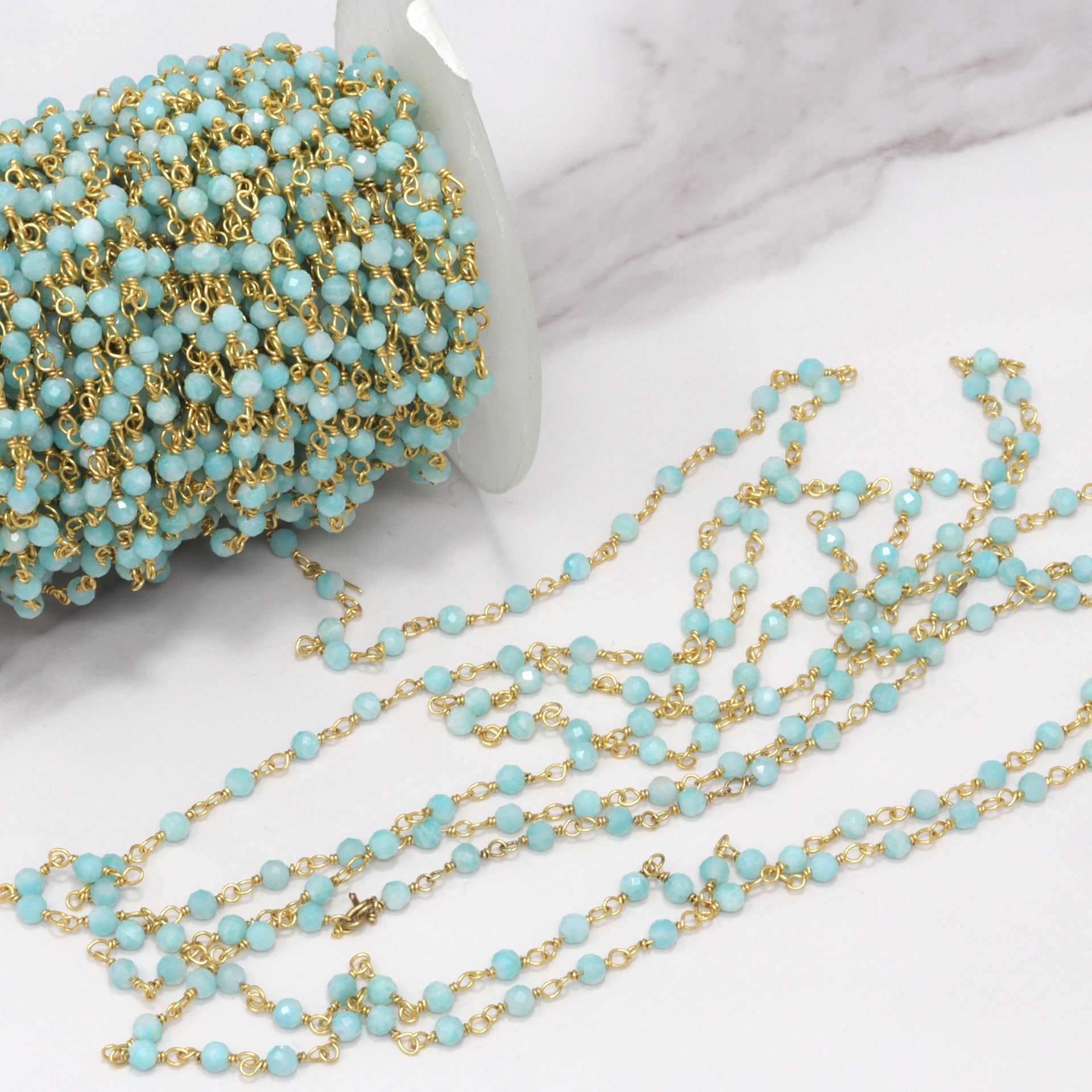 Blue Amazonite 3mm Faceted Rounds Rosary Chain Sterling Silver with Gold Plating Wire Wrap Chain by the Foot