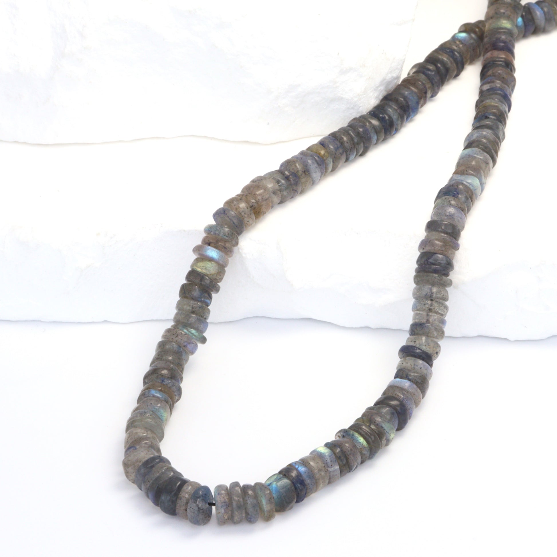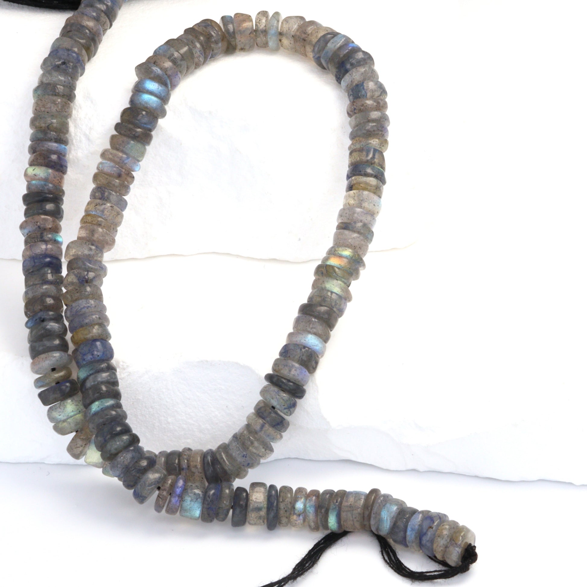 Discover the enchanting allure of our 13" Full Bead Strand of Blue Labradorite Smooth Tires 5mm beads. As a gemstone wholesaler, we provide high-quality, ethereal blue Labradorite beads that are perfect for creating unique and captivating jewelry pieces. Each bead is meticulously shaped into a smooth tire design, measuring 5mm, and strung together to form a full 13" strand. The mesmerizing blue hue of the Labradorite, coupled with its natural iridescence, adds a touch of mystique and elegance to any jewelry design. Ideal for jewelry designers and stores, these beads are not only visually stunning but also durable and long-lasting. Elevate your jewelry collection with the magical charm of our Blue Labradorite Smooth Tires 5mm beads.