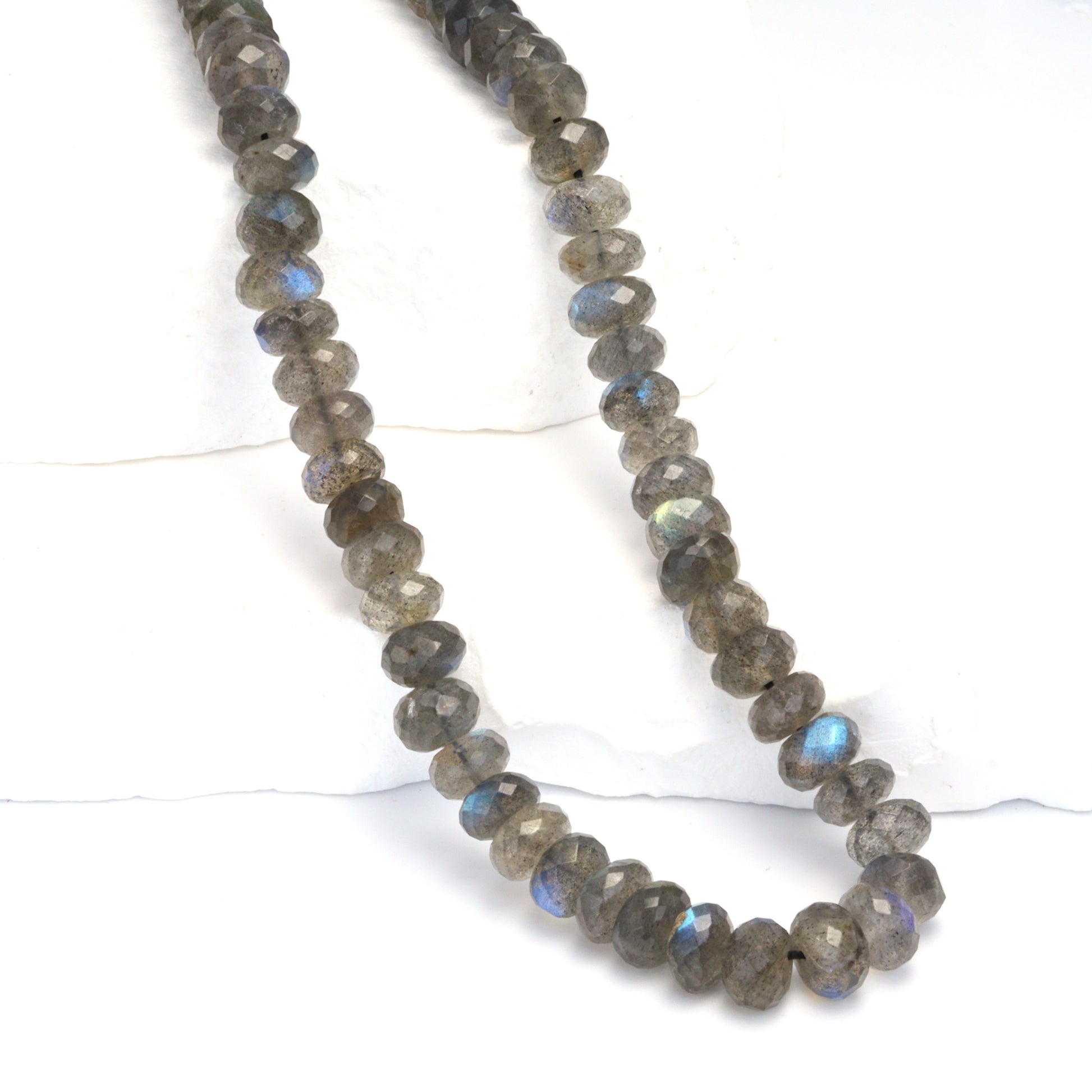 Discover the enchanting allure of our 13" Full Bead Strand of Blue Labradorite Faceted Rondelles. Each 7mm bead is meticulously crafted, showcasing the unique, captivating hues of blue that Labradorite is renowned for. These gemstone beads are perfect for jewelry designers and stores seeking high-quality, wholesale gemstones. The faceted rondelle shape of each bead adds a touch of sophistication and sparkle, making them ideal for creating stunning necklaces, bracelets, and earrings. Our Blue Labradorite Faceted Rondelles are not just beads, they are a testament to the beauty of nature, ready to be transformed into exquisite pieces of jewelry.