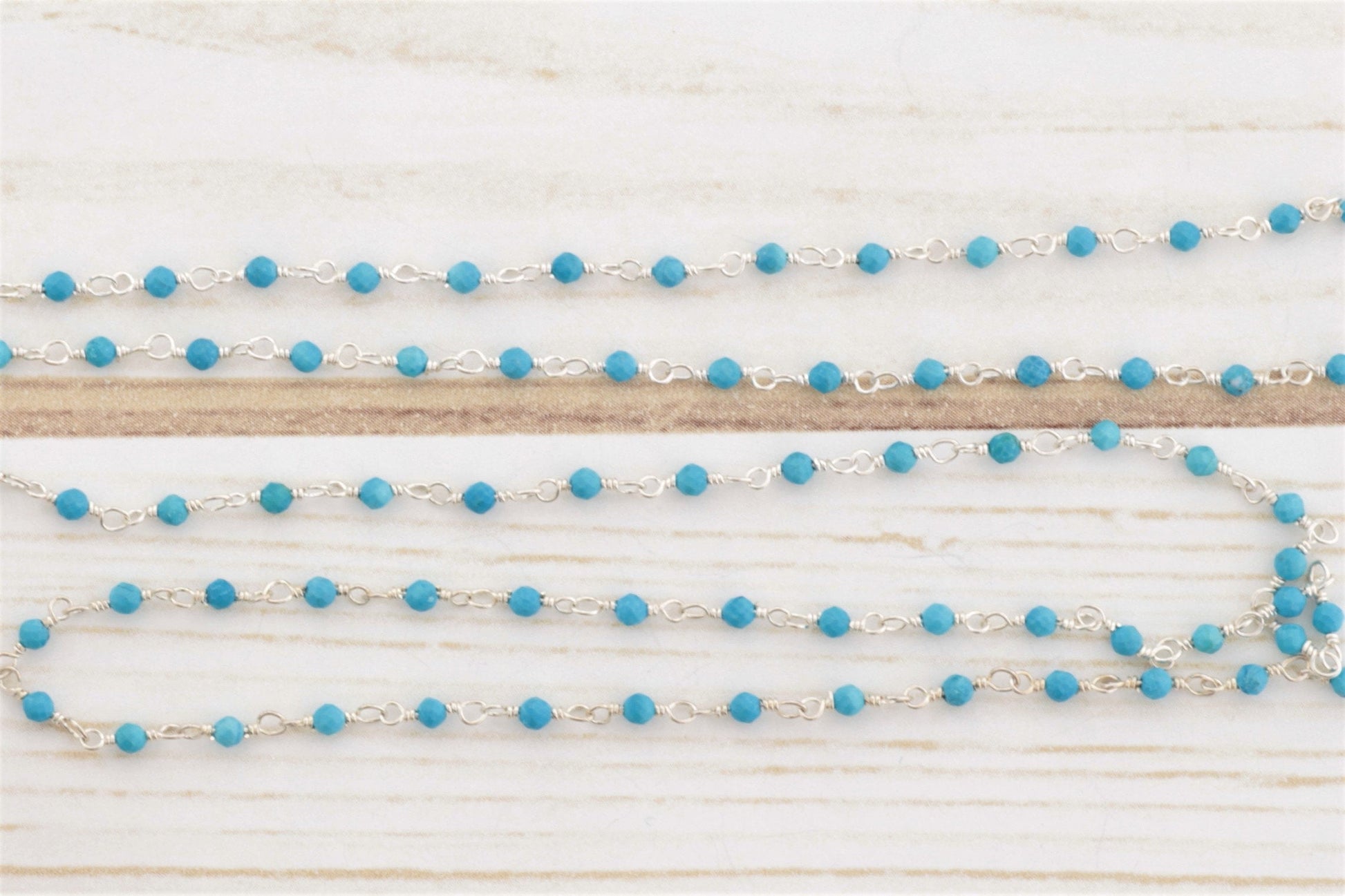 Blue Turquoise (R) 2.5mm Faceted Rounds Rosary Chain Sterling Silver Wire Wrap Chain by the Foot