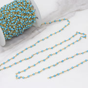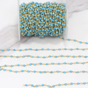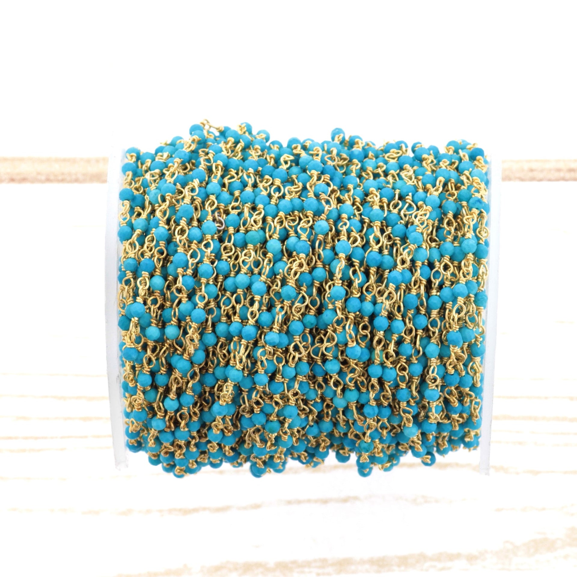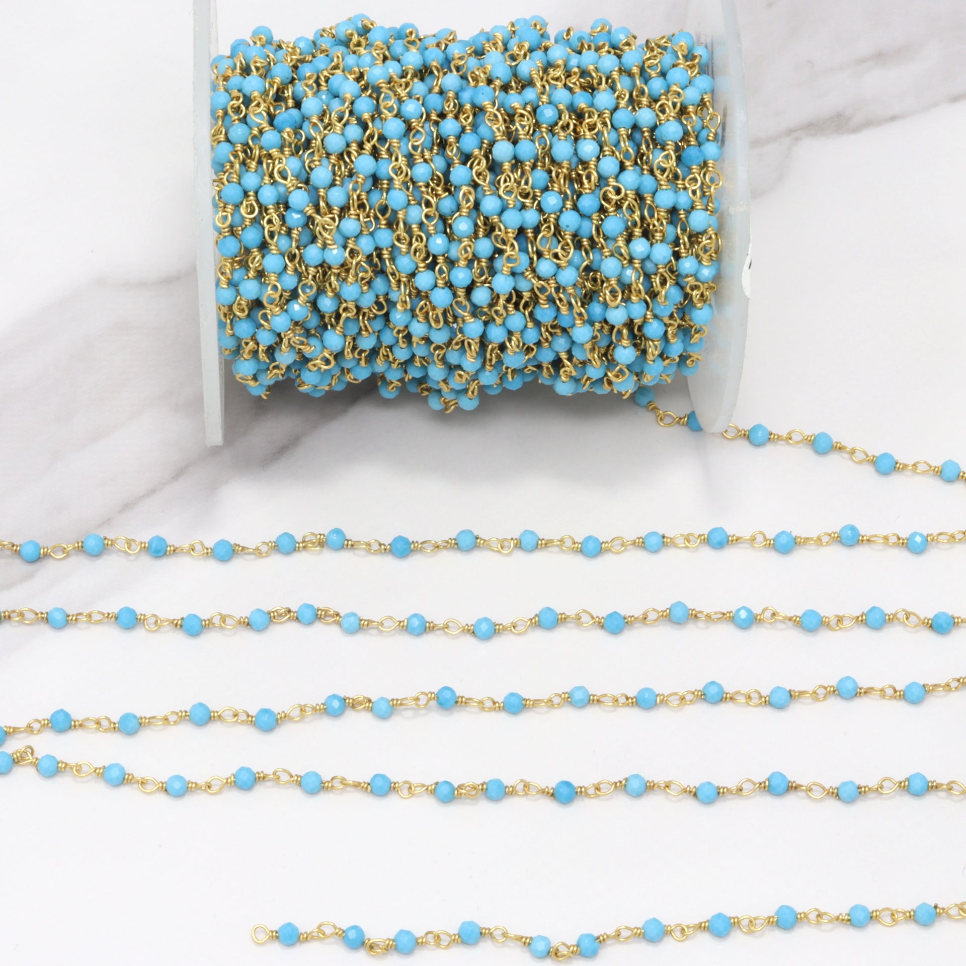 Blue Turquoise (R) 2.5mm Faceted Rounds Rosary Chain Sterling Silver with Gold Plating Wire Wrap Chain by the Foot