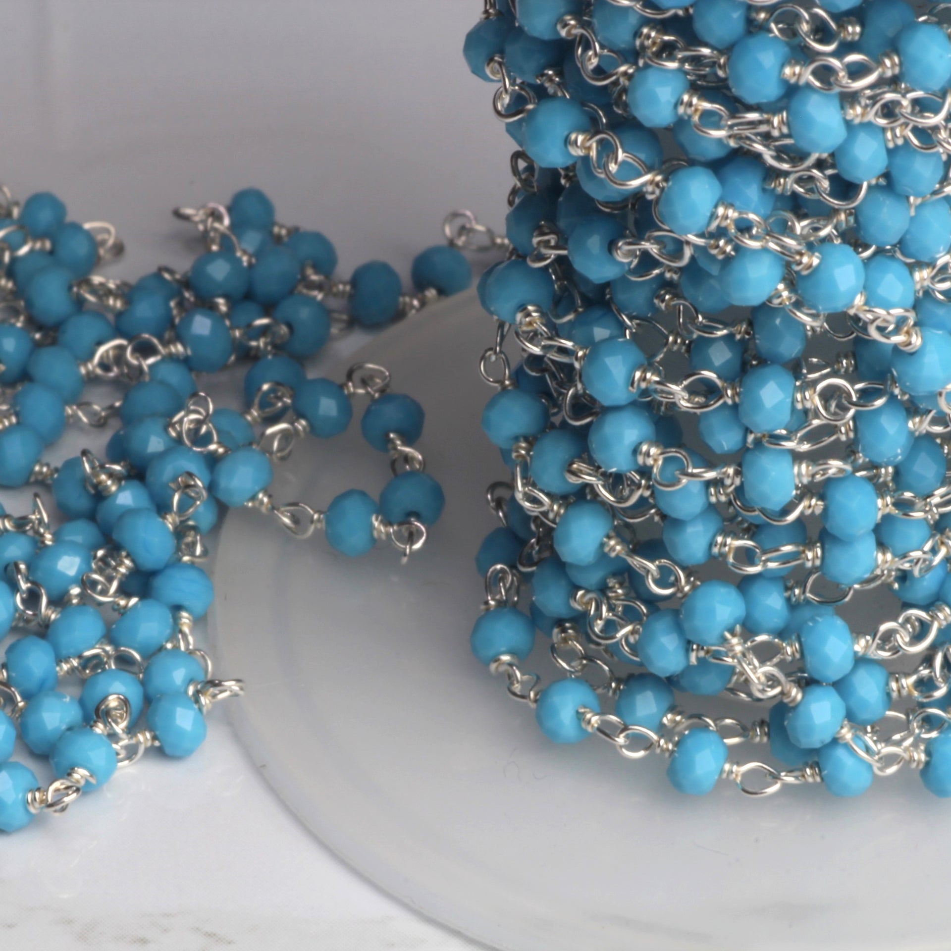 Blue Turquoise (R) 3mm Faceted Rondelles Rosary Chain Sterling Silver Wire Wrap Chain by the Foot