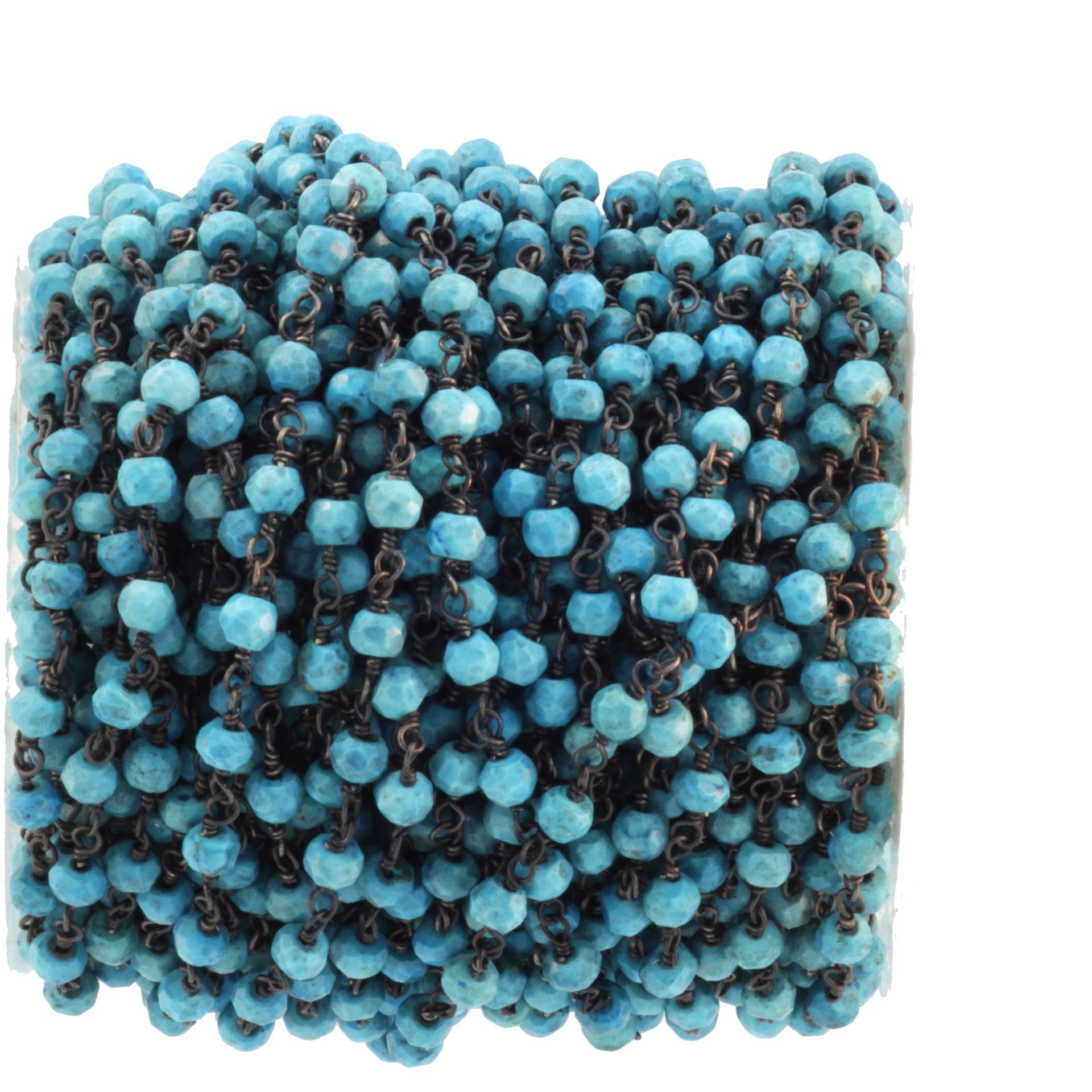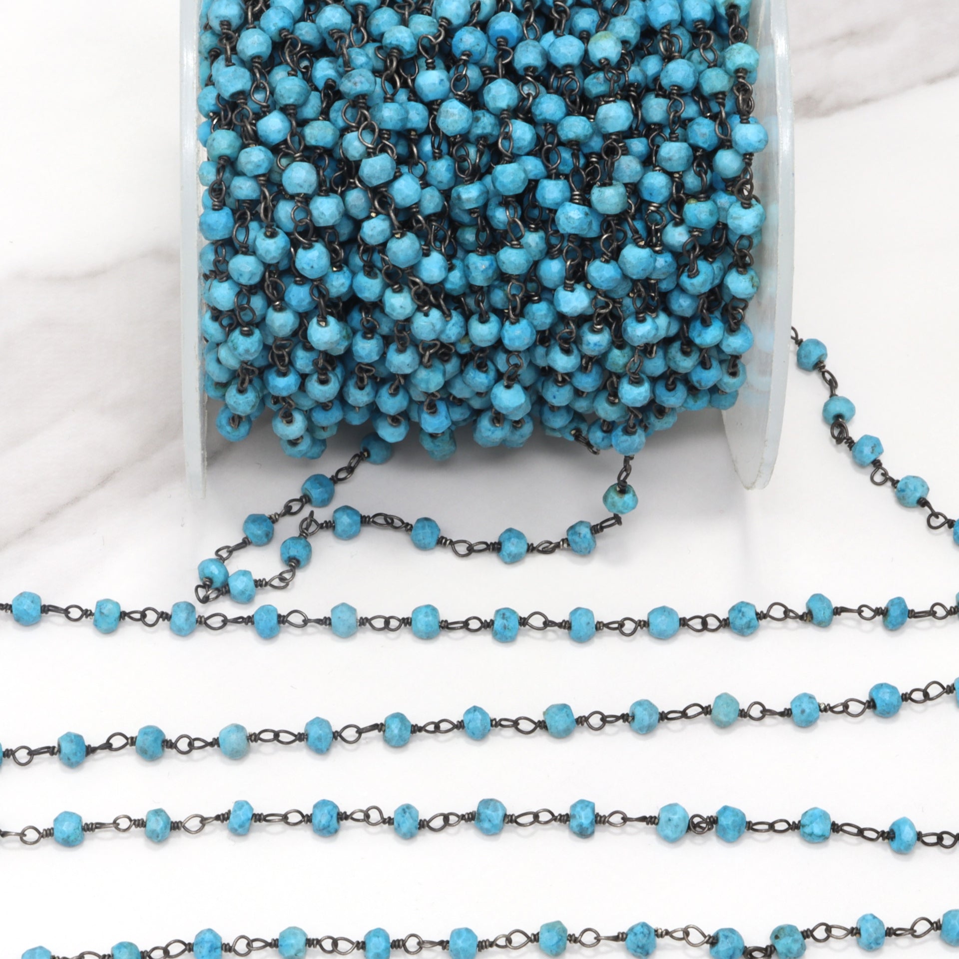 Blue Turquoise (R) 4mm Faceted Rondelles Rosary Chain Sterling Silver with Black Rhodium Plating Wire Wrap Chain by the Foot