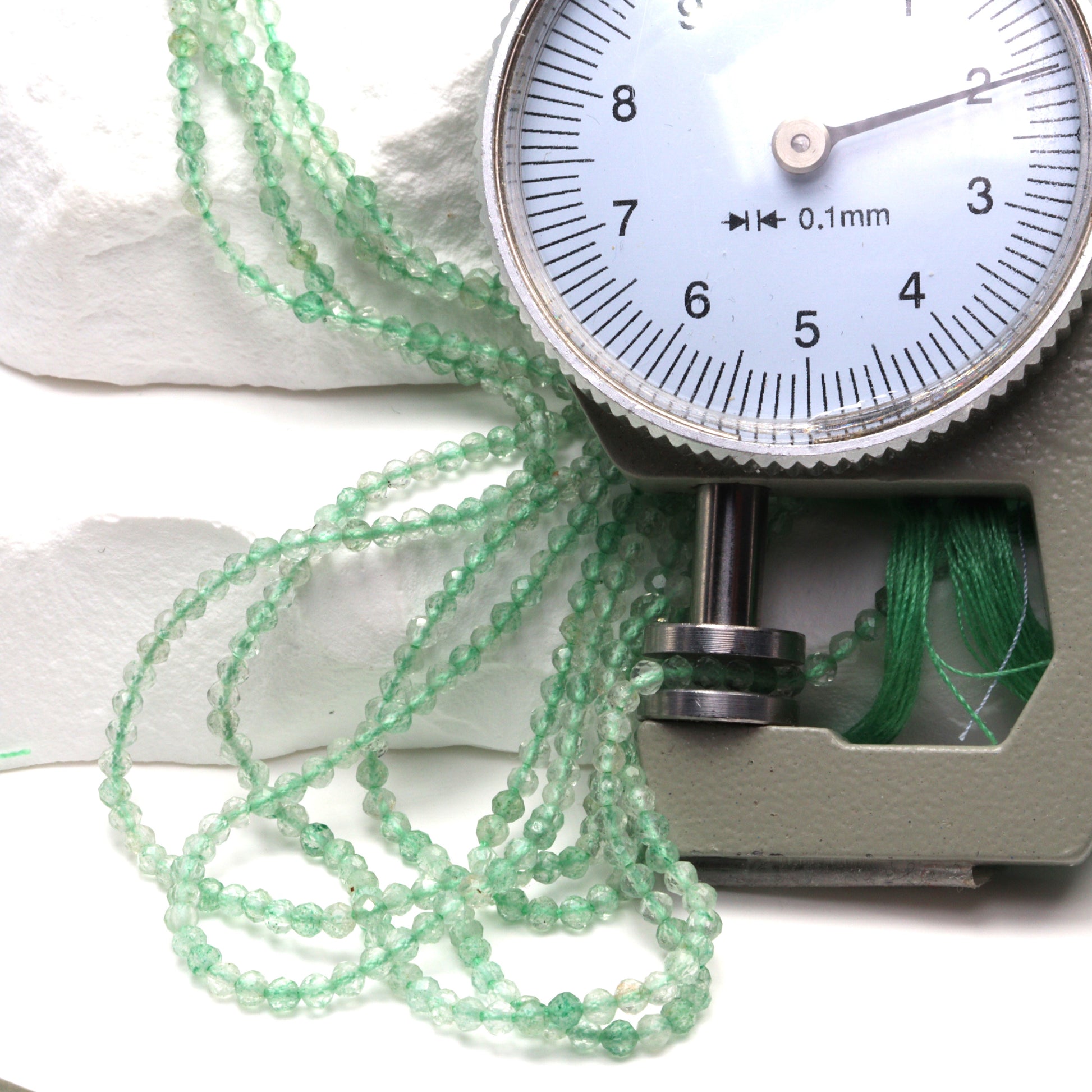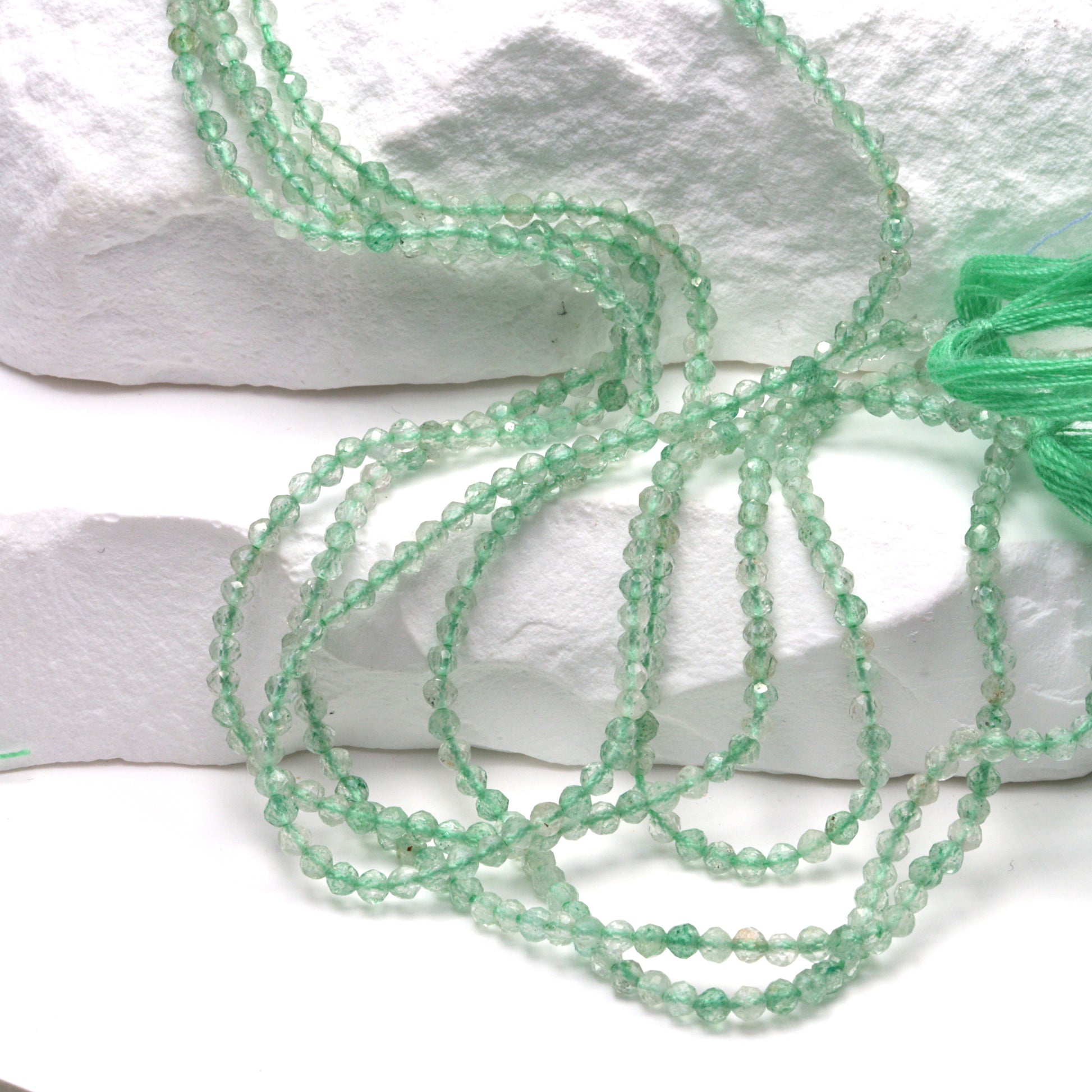 Discover the exquisite beauty of our 13" Full Bead Strand of Green Amethyst Faceted Rounds. These 2mm beads are meticulously crafted to showcase the unique allure of green amethyst, a gemstone renowned for its soothing, calming properties. Each bead is faceted to perfection, reflecting light in a mesmerizing dance that enhances the stone's natural color and clarity. Ideal for jewelry designers and stores, these wholesale gemstone beads can be transformed into stunning pieces of jewelry that captivate and inspire. Whether you're creating a delicate bracelet or a statement necklace, these green amethyst beads will add a touch of elegance and sophistication to any design.
