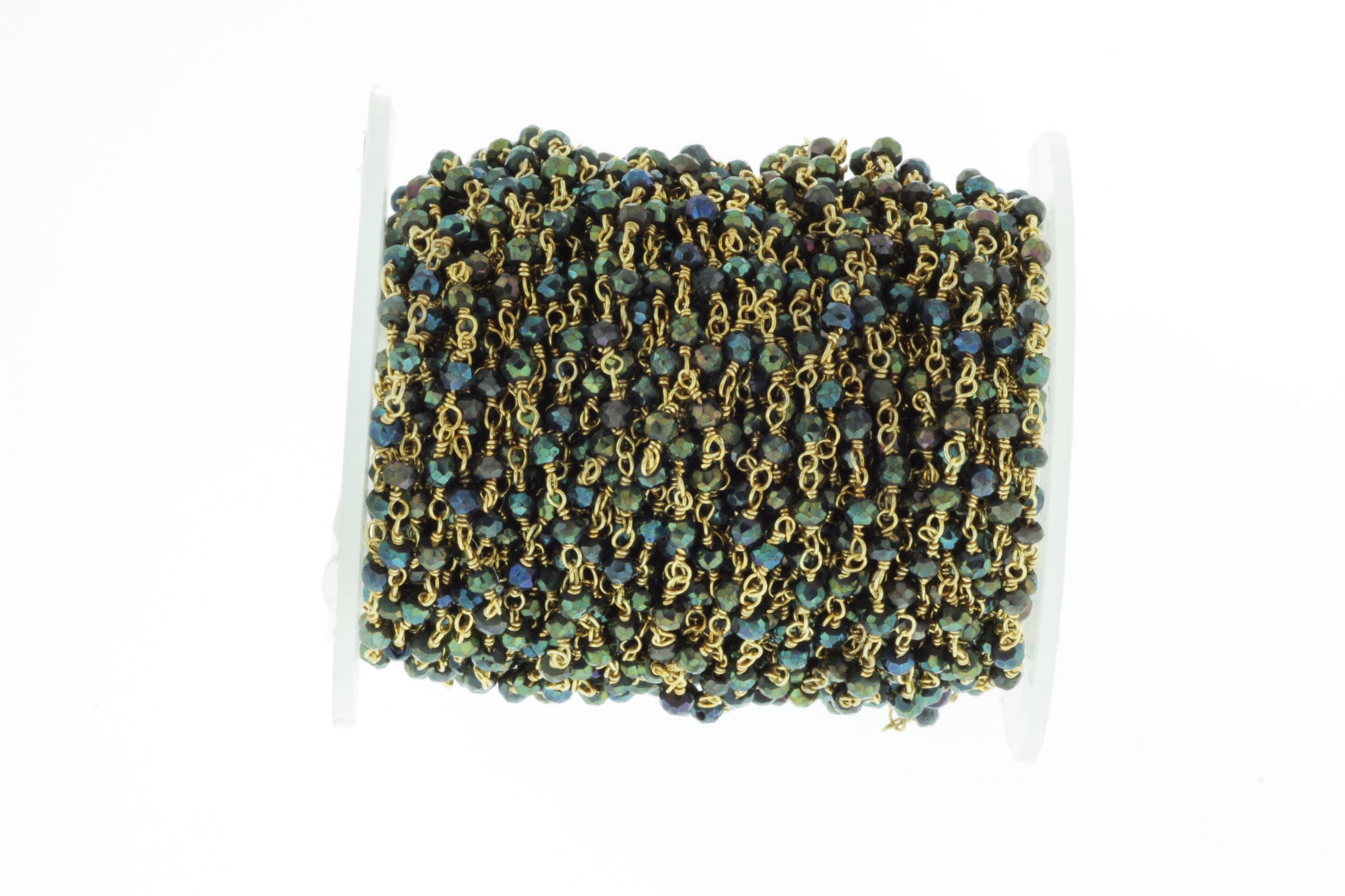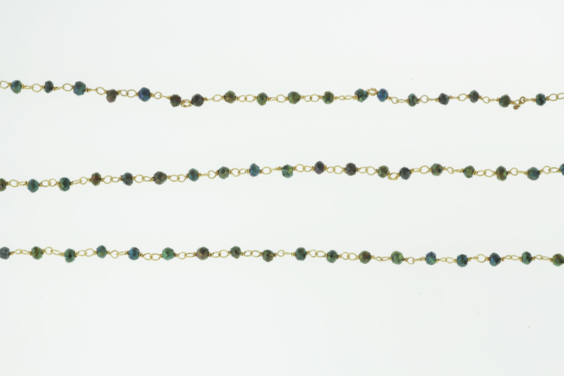 Green Coated Black Spinel 3mm Faceted Rondelles Rosary Chain Sterling Silver with Gold Plating Wire Wrap Chain by the Foot