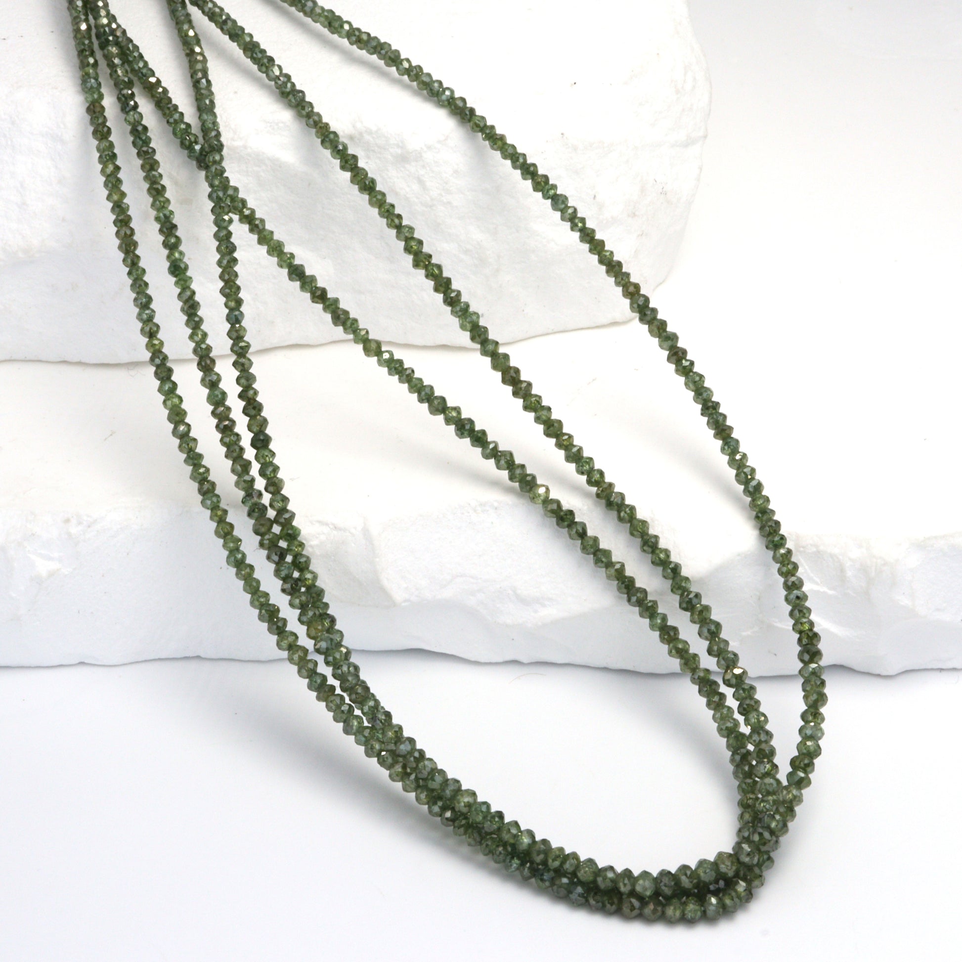Elevate your jewelry designs with the unparalleled sophistication of our Green Diamond 1.8mm - 2.5mm Hand Faceted Rondelle Beads. Each strand of this exquisite selection boasts an array of hand-faceted green diamonds, offering a unique blend of luxury and natural allure. The diamonds, sized between 1.8mm and 2.5mm, are expertly crafted into rondelle shapes, maximizing their brilliance and captivating sparkle. The lush, verdant hues of these green diamonds evoke the freshness of nature, bringing an organic elegance to any piece they adorn. Perfect for creating high-end, bespoke jewelry, these beads add a touch of exclusivity and refined taste. The rarity of green diamonds, coupled with their hand-faceted craftsmanship, makes this strand a coveted item for designers and retailers aiming to offer something truly unique and mesmerizing. Whether incorporated into minimalist designs or used as the centerpiece in more elaborate creations, our Green Diamond Rondelle Beads promise to deliver sophistication, brilliance, and a touch of earthy charm to your jewelry collection.