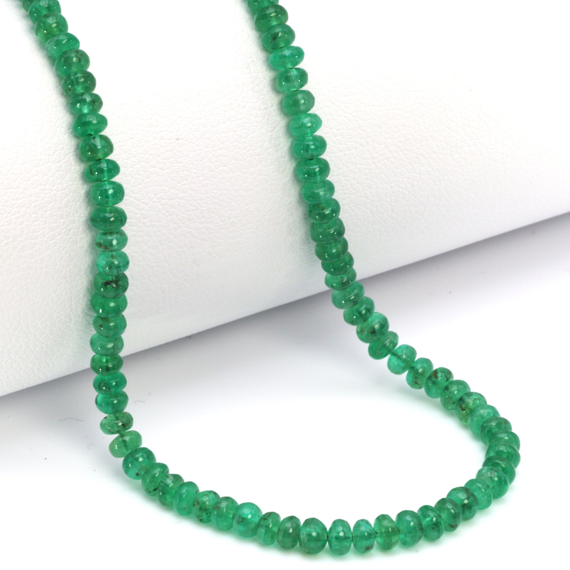 Discover the exquisite beauty of our 16" Full Bead Strand of Green Emerald Smooth Rondelles. These 3mm beads are meticulously crafted from genuine emerald, a gemstone renowned for its vibrant green hue and timeless appeal. Each bead is smoothly polished to perfection, ensuring a comfortable fit and a stunning shine. Ideal for jewelry designers and stores, these emerald beads can be transformed into elegant necklaces, bracelets, or earrings. Add a touch of luxury and sophistication to your jewelry collection with our wholesale green emerald beads. Their rich color and high-quality finish make them a must-have for any jewelry design project.