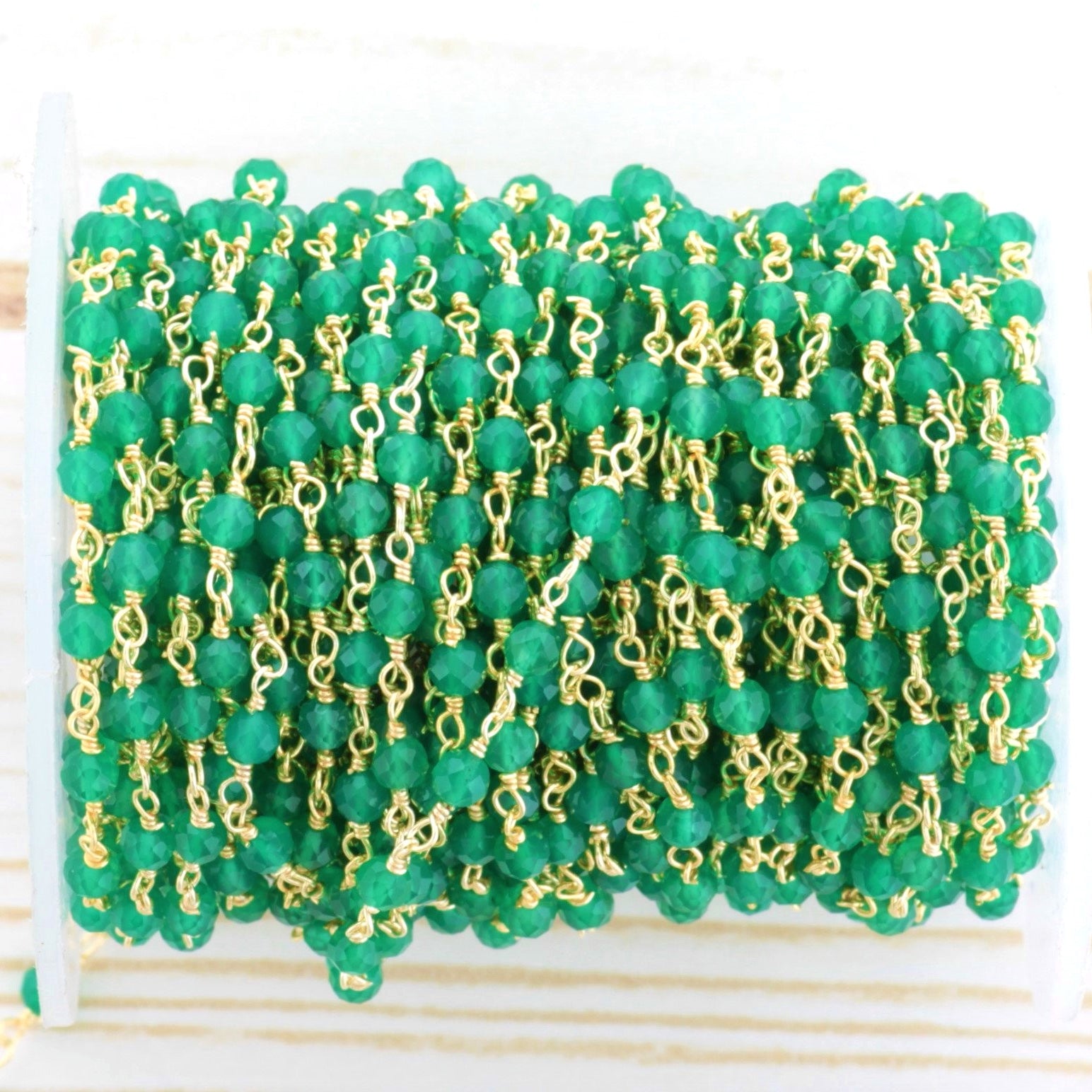 Green Onyx 3.5mm Faceted Rounds Rosary Chain Sterling Silver with Gold Plating Wire Wrap Chain by the Foot