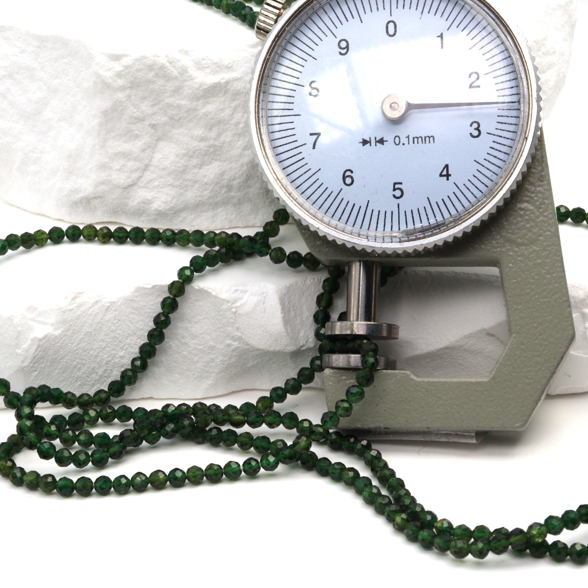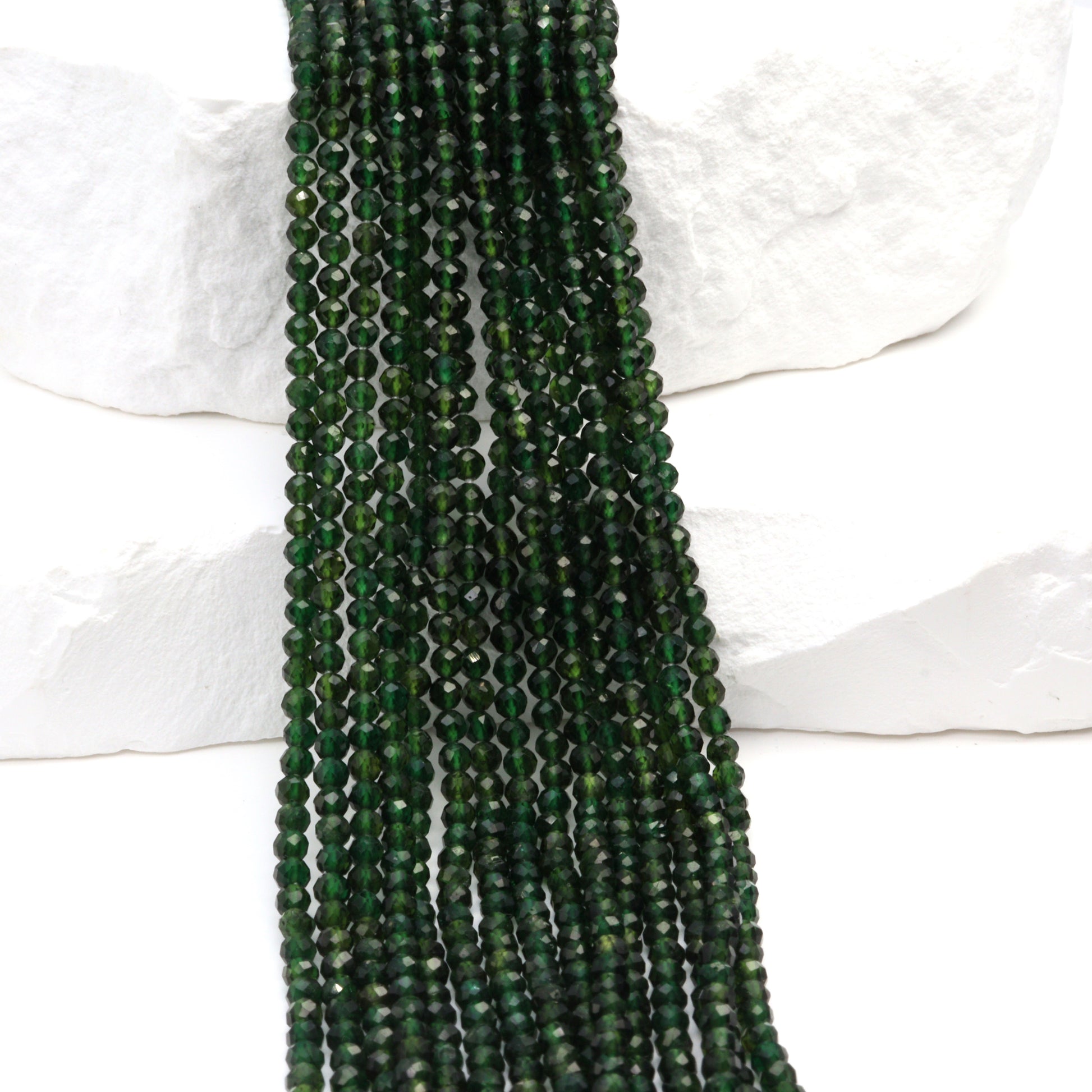 Introducing our radiant strand of green tourmaline beads, a true testament to nature's artistry and elegance. Each bead, precisely faceted to a size of 2.5mm, gleams with the vibrant hues of lush forests and emerald meadows, capturing the very essence of nature's palette. The intricate facets reflect light in mesmerizing patterns, ensuring that every piece you create with these beads stands out with unparalleled brilliance. Specially curated for discerning jewelry designers and upscale boutiques, this strand is more than just an accessory-it's a journey into the heart of verdant beauty. Add a touch of organic splendor to your designs with our green tourmaline beads, where luxury meets the wild enchantment of the earth.