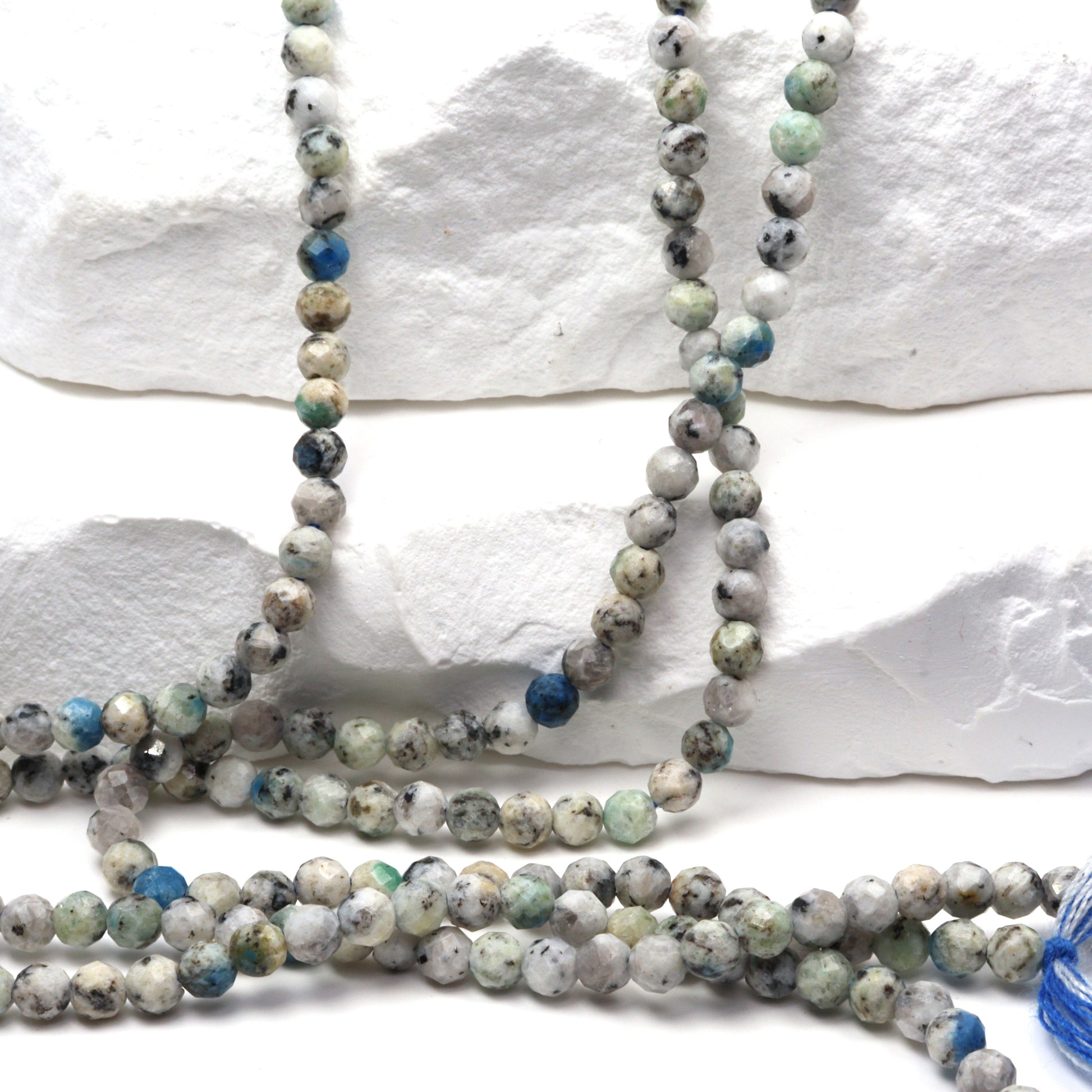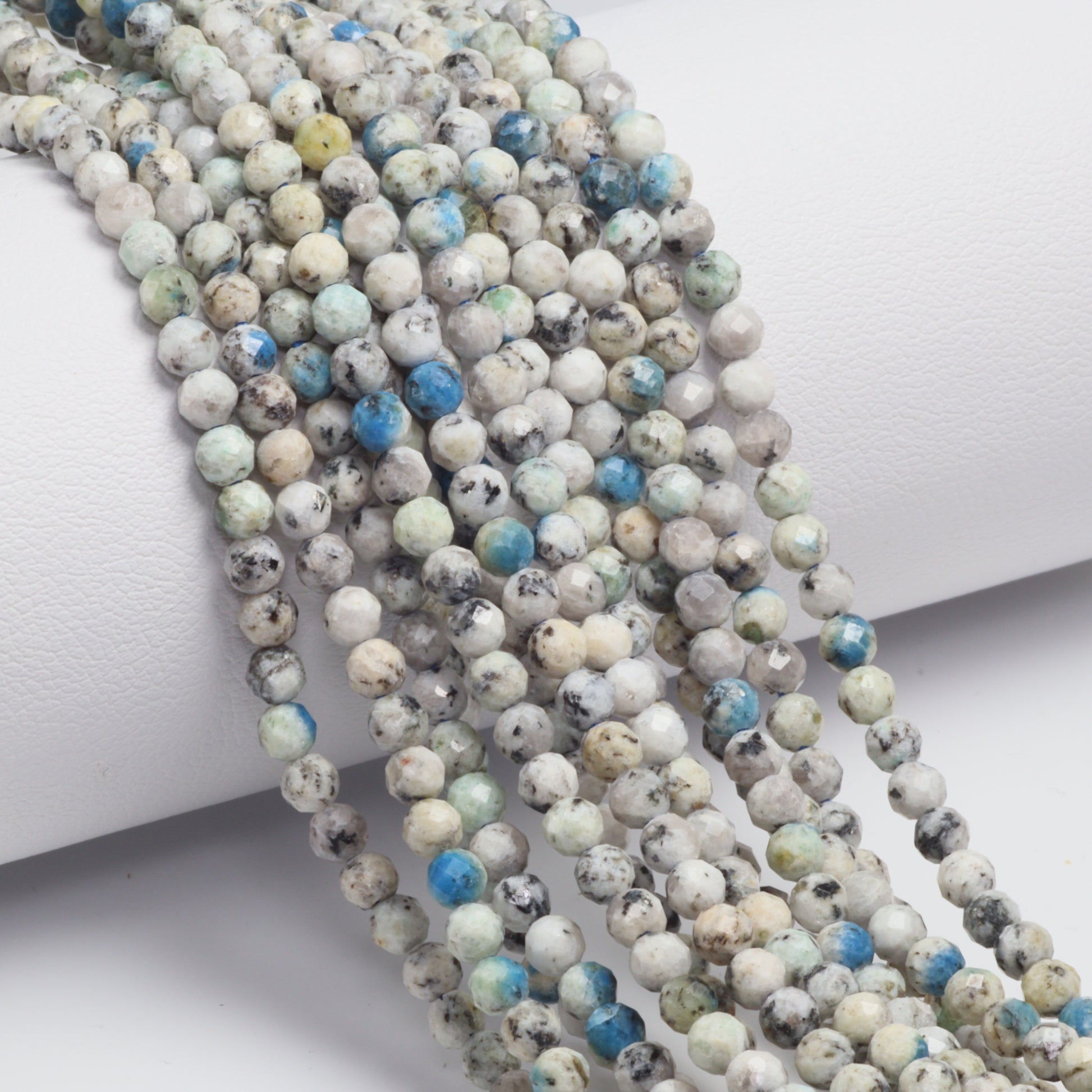 Discover the exquisite beauty of our 13" Full Bead Strand of K2 Jasper Faceted Rounds. These 3.5mm beads are meticulously crafted from high-quality K2 Jasper, a unique gemstone known for its striking blue and white patterns. Each bead is expertly faceted to enhance its natural beauty and reflect light in a captivating manner. Ideal for jewelry designers and stores, these gemstone beads can be transformed into stunning pieces of jewelry that will surely captivate your customers. As a trusted gemstone wholesaler, we ensure that every bead strand we supply is of the highest quality, offering you exceptional value for your investment. Elevate your jewelry designs with the mesmerizing allure of our K2 Jasper Faceted Rounds.