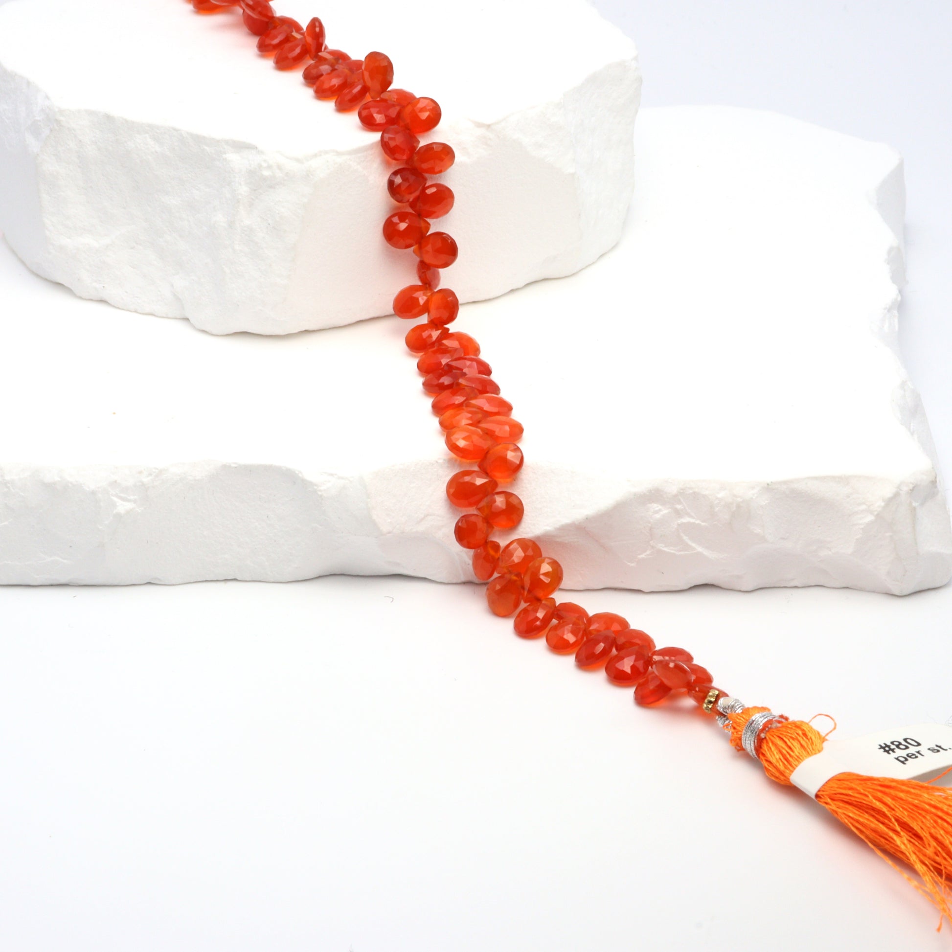Experience the vibrant allure of our 8" Full Bead Strand of Orange Carnelian Faceted Pear Shaped Briolettes. Each 7x5mm bead is meticulously crafted to showcase the unique beauty of Carnelian, a gemstone renowned for its warm, fiery hues. These faceted pear-shaped briolettes catch the light beautifully, adding a touch of sparkle to any jewelry design. Ideal for jewelry designers and stores, these high-quality Carnelian beads offer a stunning blend of durability and aesthetic appeal. Whether you're creating a statement necklace or a delicate bracelet, these beads will infuse your designs with a burst of color and a hint of luxury.
