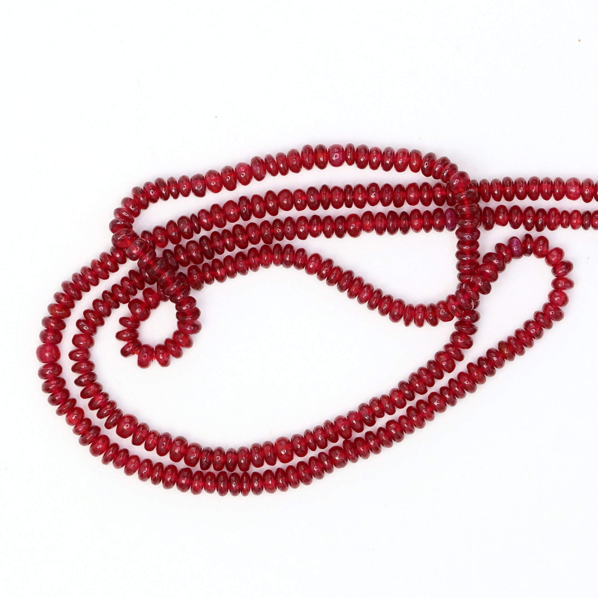 Discover the exquisite beauty of our 16" Full Bead Strand of Red Ruby Smooth Rondelles. These 2.5mm beads are meticulously crafted from genuine, high-quality ruby, boasting a vibrant red hue that adds a touch of elegance and sophistication to any jewelry piece. Ideal for jewelry designers and stores, these ruby beads are perfect for creating stunning necklaces, bracelets, and earrings. Each bead is smoothly polished to perfection, ensuring a comfortable fit and wear. As a leading gemstone wholesaler, we guarantee the authenticity and quality of our ruby beads. Add a splash of color and luxury to your jewelry designs with our red ruby smooth rondelles.