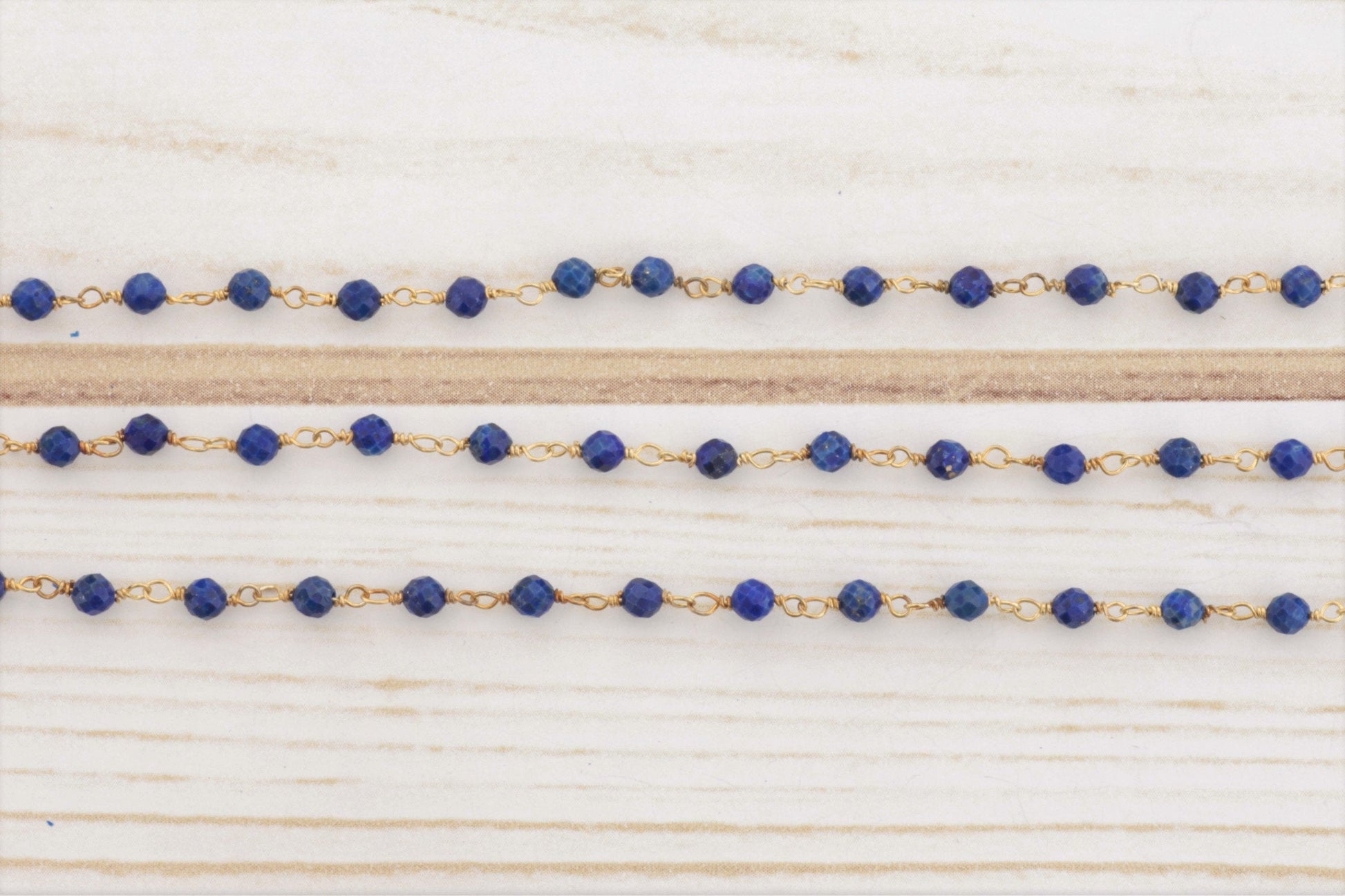 Royal Blue Lapis Lazuli 3.25mm Faceted Rondelles Rosary Chain Sterling Silver with Gold Plating Wire Wrap Chain by the Foot