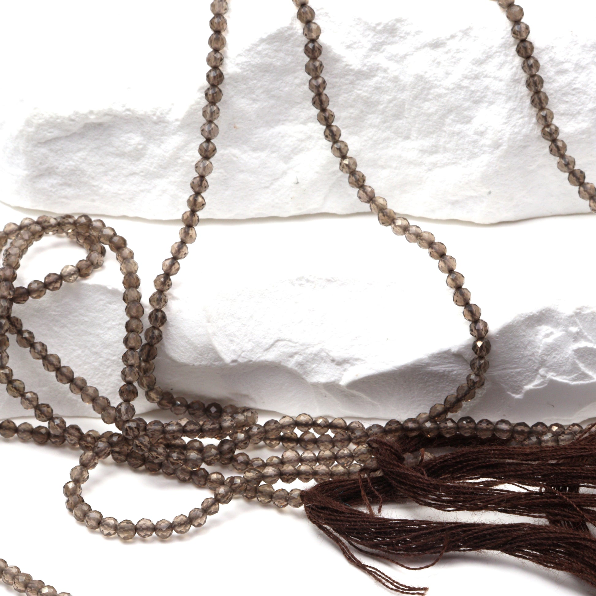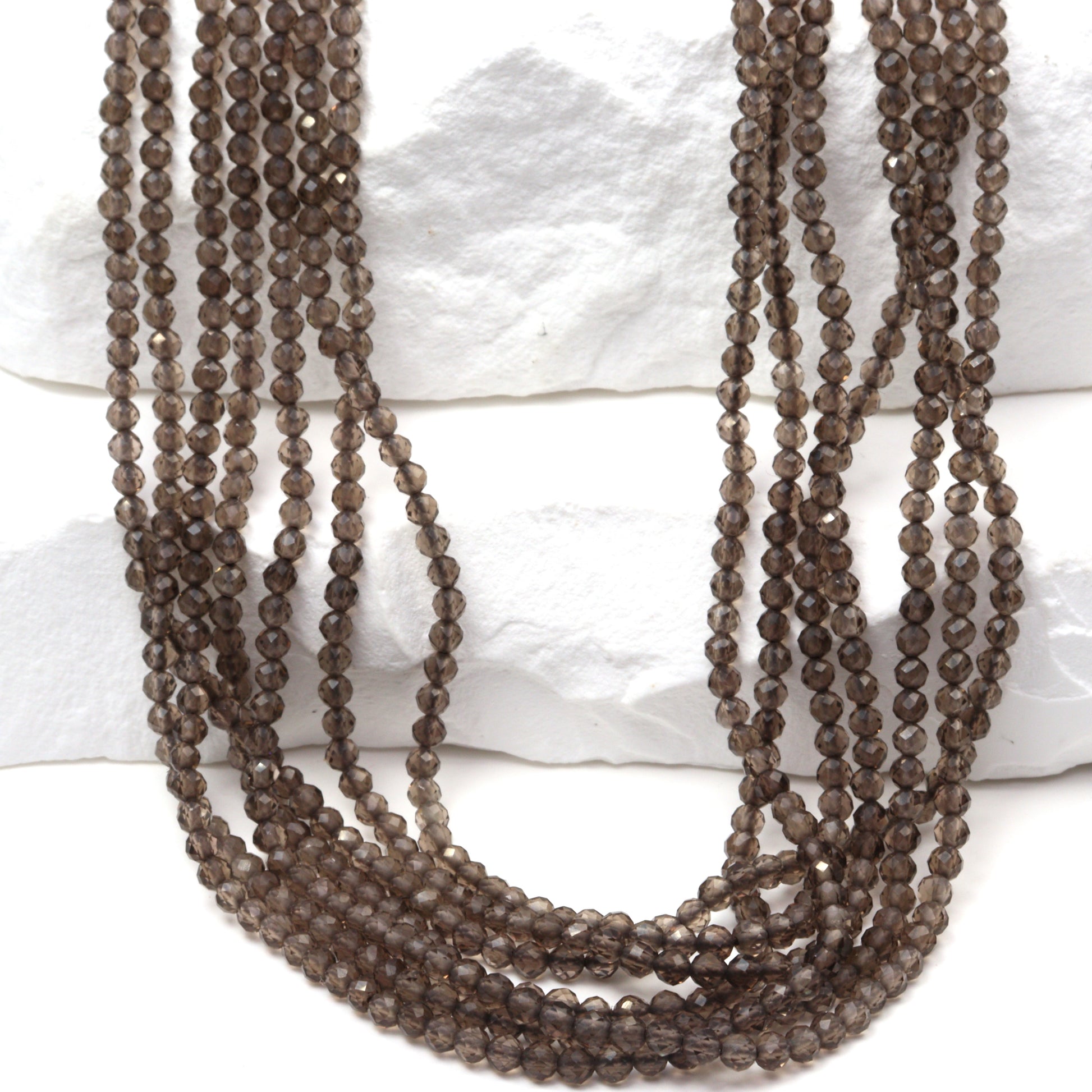 Discover the allure of our 13" Full Bead Strand of Smoky Quartz Faceted Rounds. These 2mm beads are meticulously crafted, boasting a rich, smoky hue that adds a touch of sophistication to any jewelry design. As a gemstone wholesaler, we provide only the highest quality smoky quartz beads, ensuring each bead is faceted to perfection to enhance its natural beauty and luster. Ideal for jewelry designers and stores, these beads offer versatility and elegance, making them a must-have for creating stunning necklaces, bracelets, and earrings. Add these exquisite smoky quartz faceted rounds to your collection and let your creativity shine.