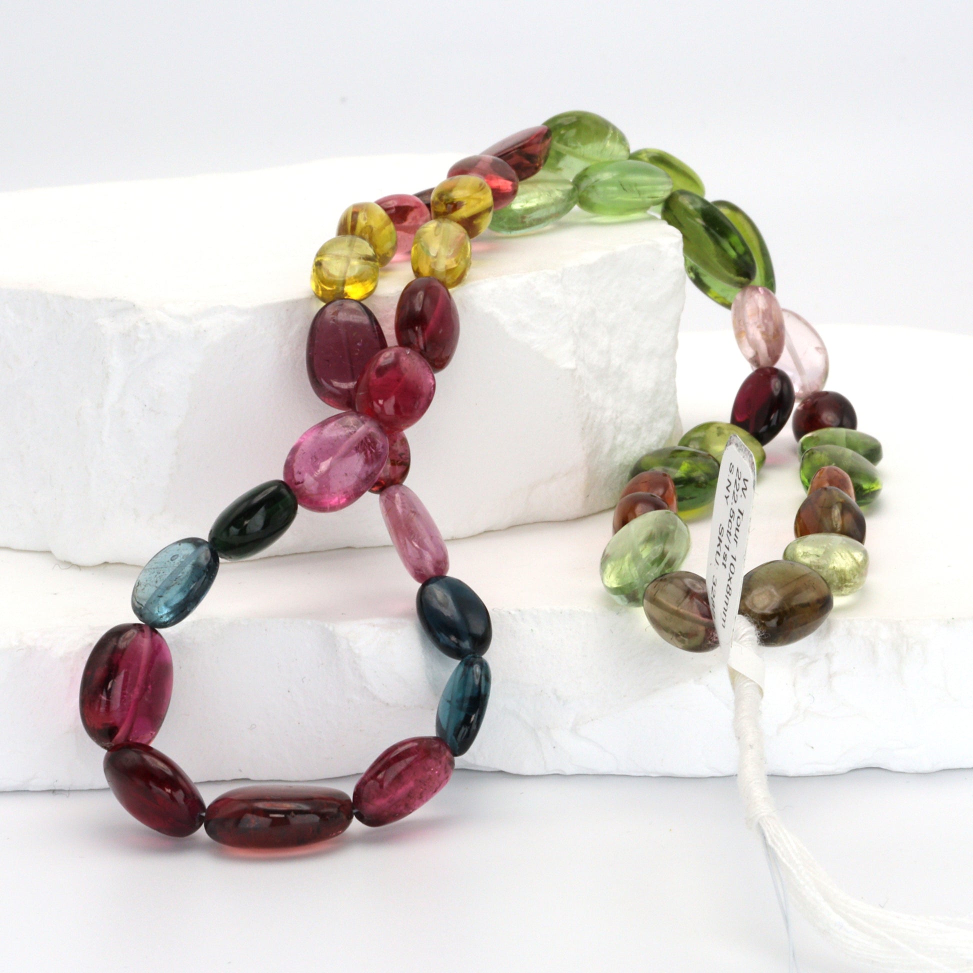 Elevate your jewelry designs with the eclectic charm of our Multi Tourmaline 10x8mm - 12x9mm Smooth Freeform Oval Beads. This strand is a treasure trove of color and form, featuring a stunning array of tourmaline in various shades, each bead unique in its smooth, freeform oval shape. Ranging in size from 10x8mm to 12x9mm, these beads present a bold and organic feel, perfect for creating statement pieces that stand out. The smooth finish of each bead enhances the natural beauty and distinct hues of the tourmaline, from blush pinks and forest greens to deep blues. Ideal for high-end jewelry designers and boutiques, these beads offer a versatile palette that can be seamlessly integrated into various styles, whether it's for elegant necklaces, chunky bracelets, or sophisticated earrings. Tourmaline is known for its array of colors and metaphysical properties, symbolizing balance and creativity, making these beads not just visually appealing but also meaningful. Our Multi Tourmaline Smooth Freeform Oval Beads are the perfect choice for those seeking to add a touch of natural elegance, vibrant color, and unique charm to their jewelry collections.