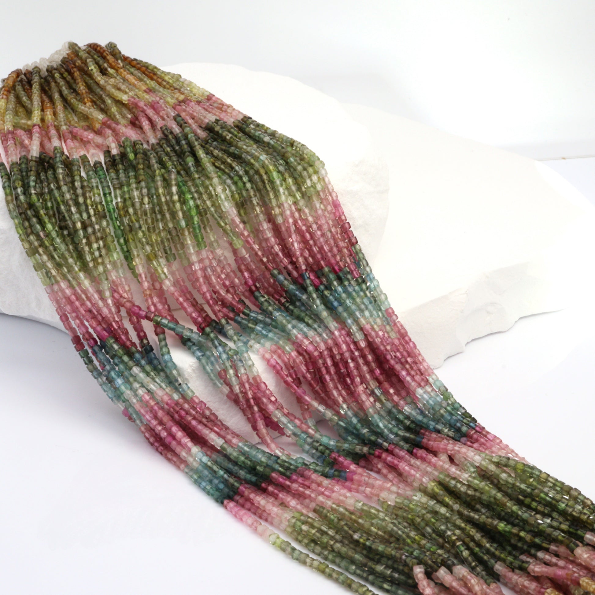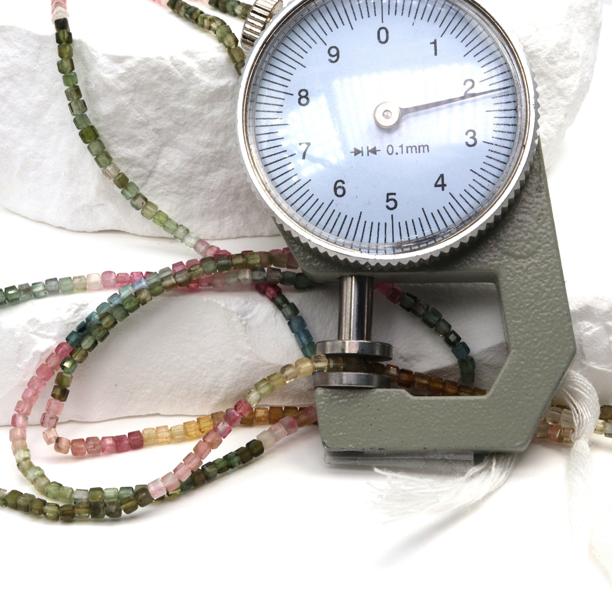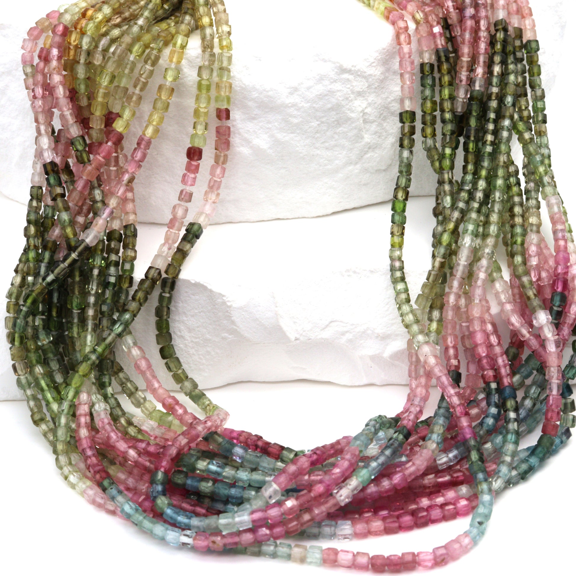Elevate your jewelry designs with the vibrant and eclectic charm of our Multi Tourmaline 2mm Faceted Cube Beads, a treasure trove for creative designers and discerning retailers. This captivating strand features an array of multi tourmaline beads, each cut into a unique 2mm cube shape and faceted to perfection, bringing a modern twist to classic elegance. The multi tourmaline, celebrated for its wide spectrum of colors from rosy pinks to forest greens, offers a playful yet sophisticated palette that can adapt to various design aesthetics. These tiny cubes catch and reflect light, creating a mesmerizing effect that adds depth and intrigue to any piece. Ideal for crafting intricate bracelets, statement necklaces, or eye-catching earrings, these beads are not just visually appealing but also carry the tourmaline's reputed properties of inspiration and healing, adding an extra layer of meaning to your jewelry. For those seeking to offer unique, high-quality, and visually stunning pieces, our Multi Tourmaline Faceted Cube Beads are the perfect choice, ensuring your designs stand out with their exceptional beauty and artisanal charm.