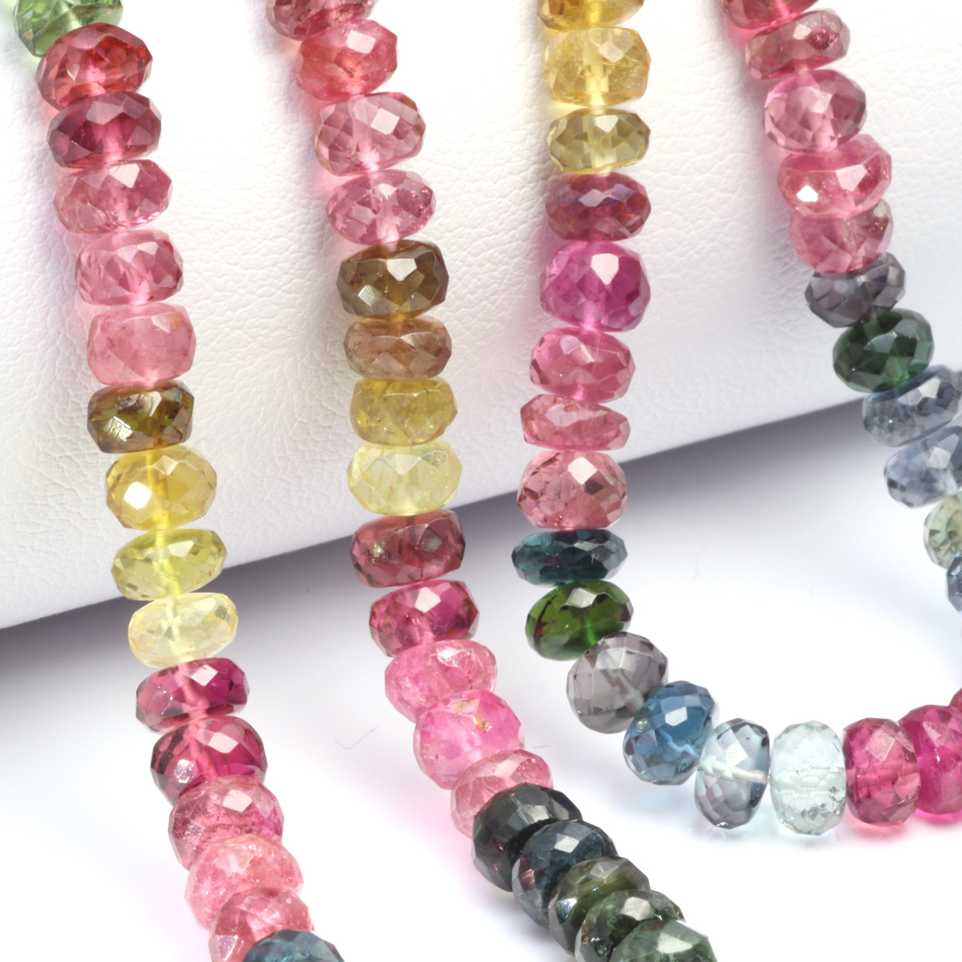 Embrace the delightful array of colors with our Multi Tourmaline 5.5mm Faceted Rondelle Beads, a captivating choice for jewelry designers and boutiques. This strand showcases the diverse and vibrant beauty of multi tourmaline, with each 5.5mm bead featuring a unique blend of colors - from rich pinks and greens to enchanting yellows and blues. The faceted rondelle cut of these beads enhances their natural brilliance, creating a sparkling effect that catches the light with every movement. Ideal for crafting statement pieces or adding a burst of color to elegant designs, these beads offer versatility and charm. Multi tourmaline is not only known for its stunning visual appeal but also for its believed properties of balancing and energizing, making these beads a meaningful addition to any jewelry piece. Perfect for designers looking to create eye-catching, high-quality jewelry that combines artistic flair with a touch of nature's magic, our Multi Tourmaline Faceted Rondelle Beads are a superb choice, ensuring each creation stands out with its distinctive allure and exquisite craftsmanship.