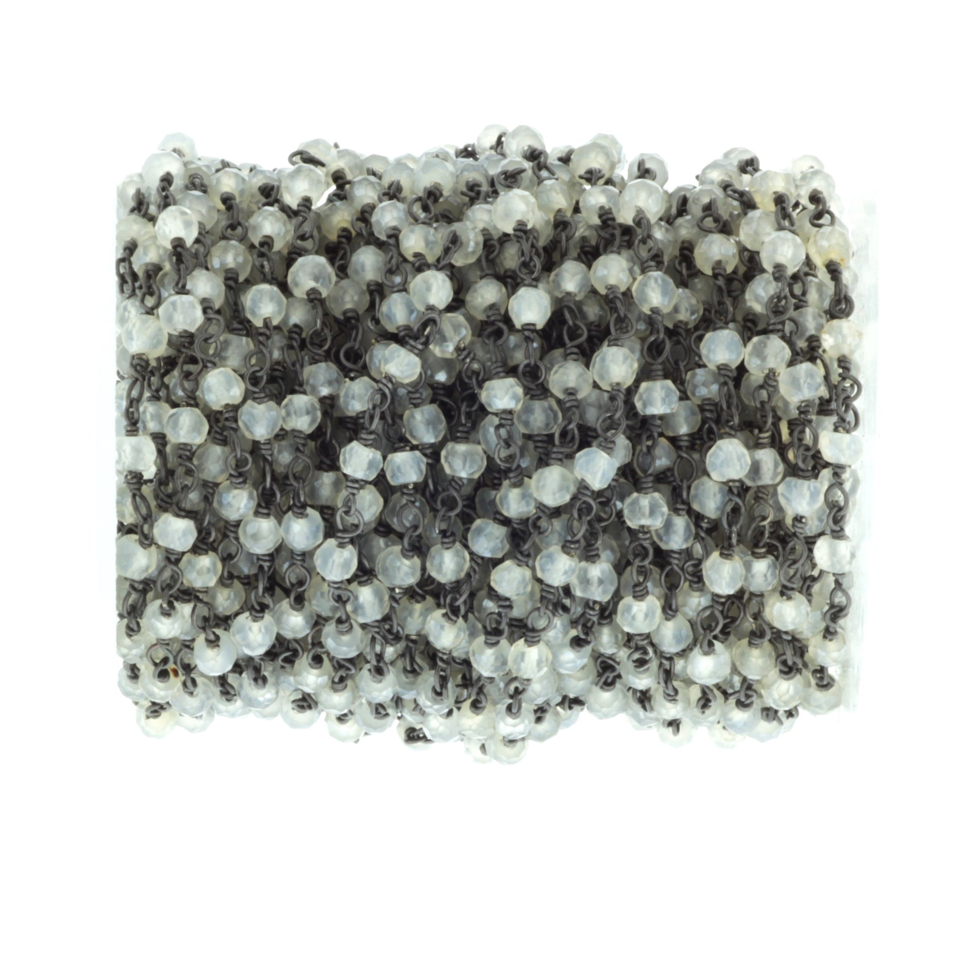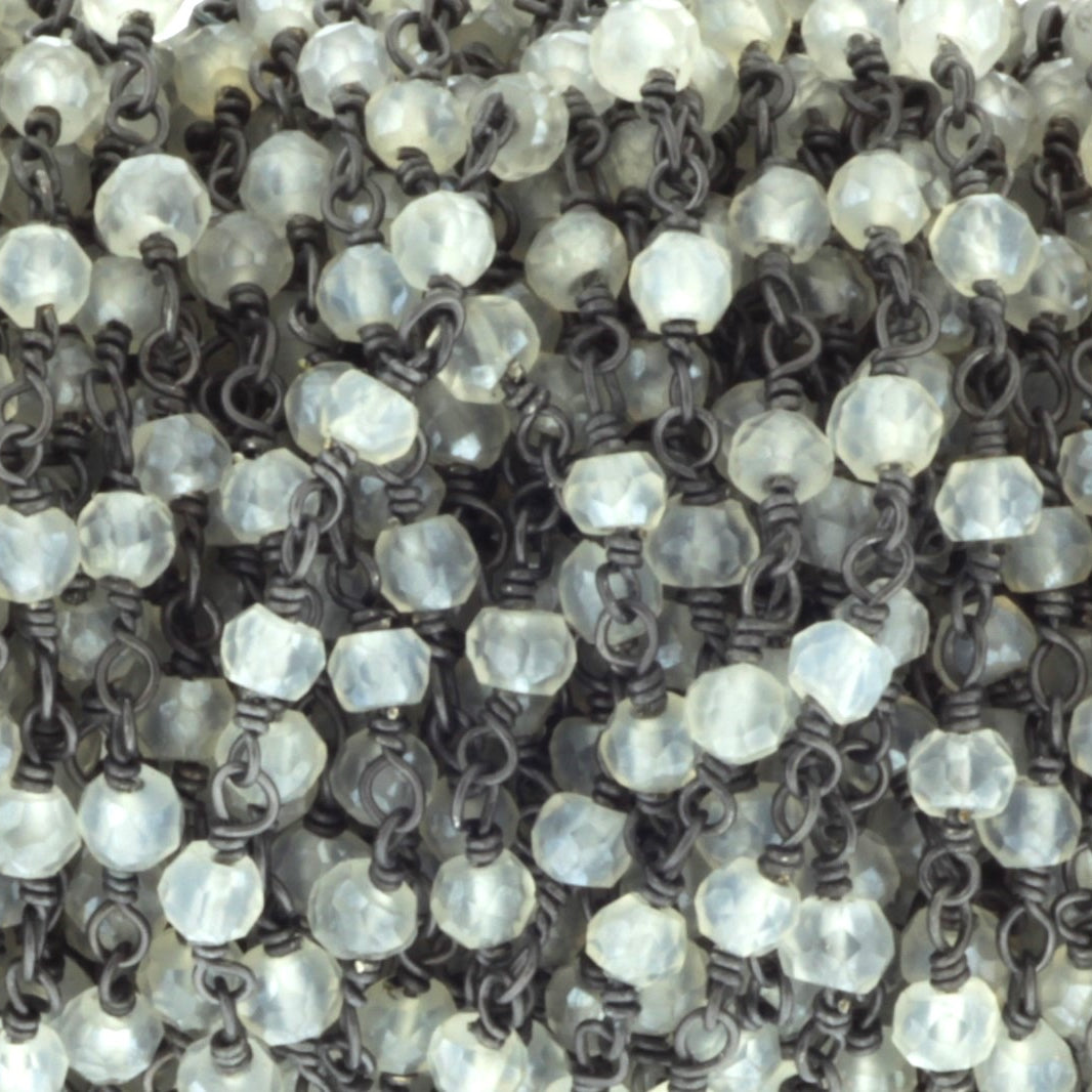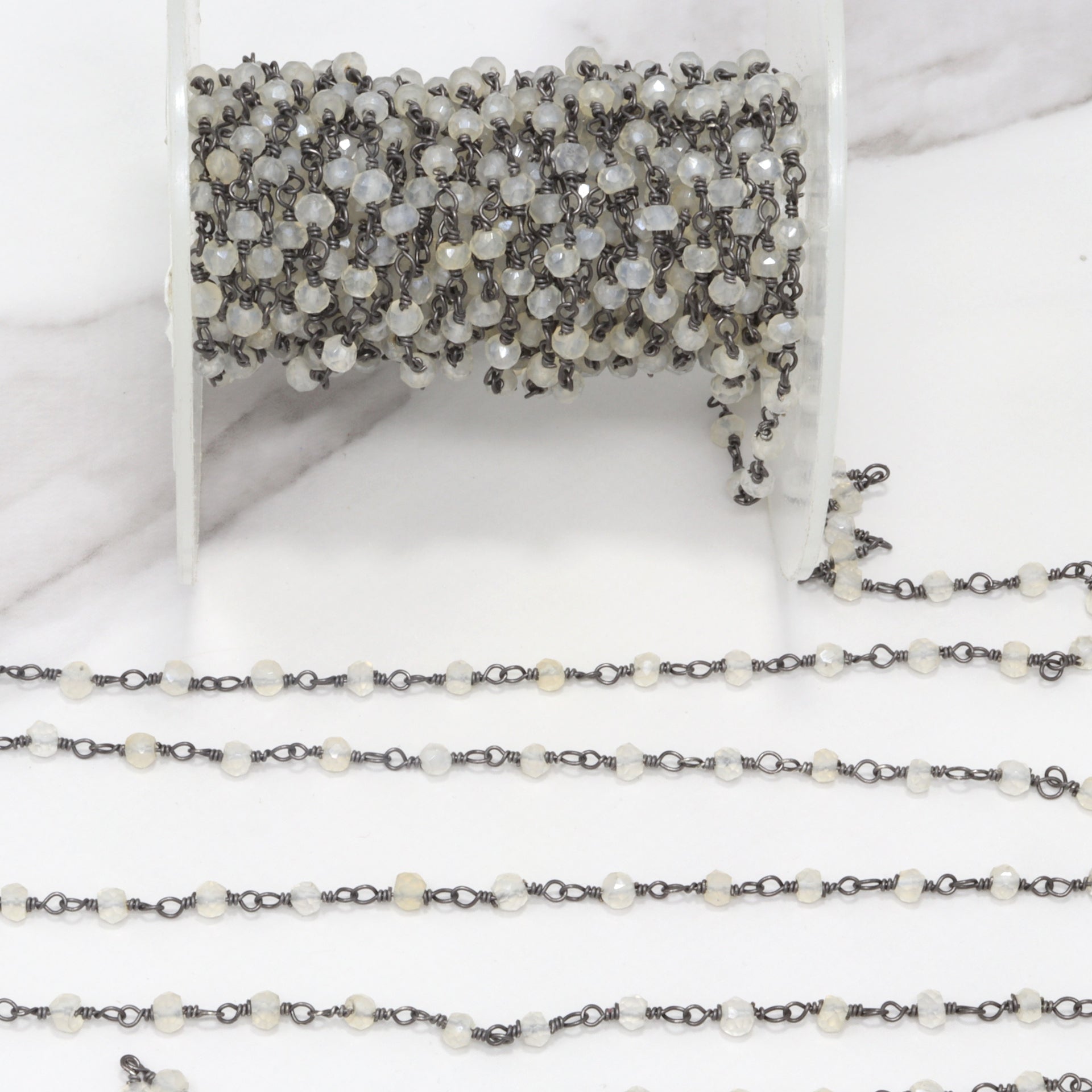 White Moonstone 3.5mm Faceted Rondelles Rosary Chain Sterling Silver with Black Rhodium Plating Wire Wrap Chain by the Foot