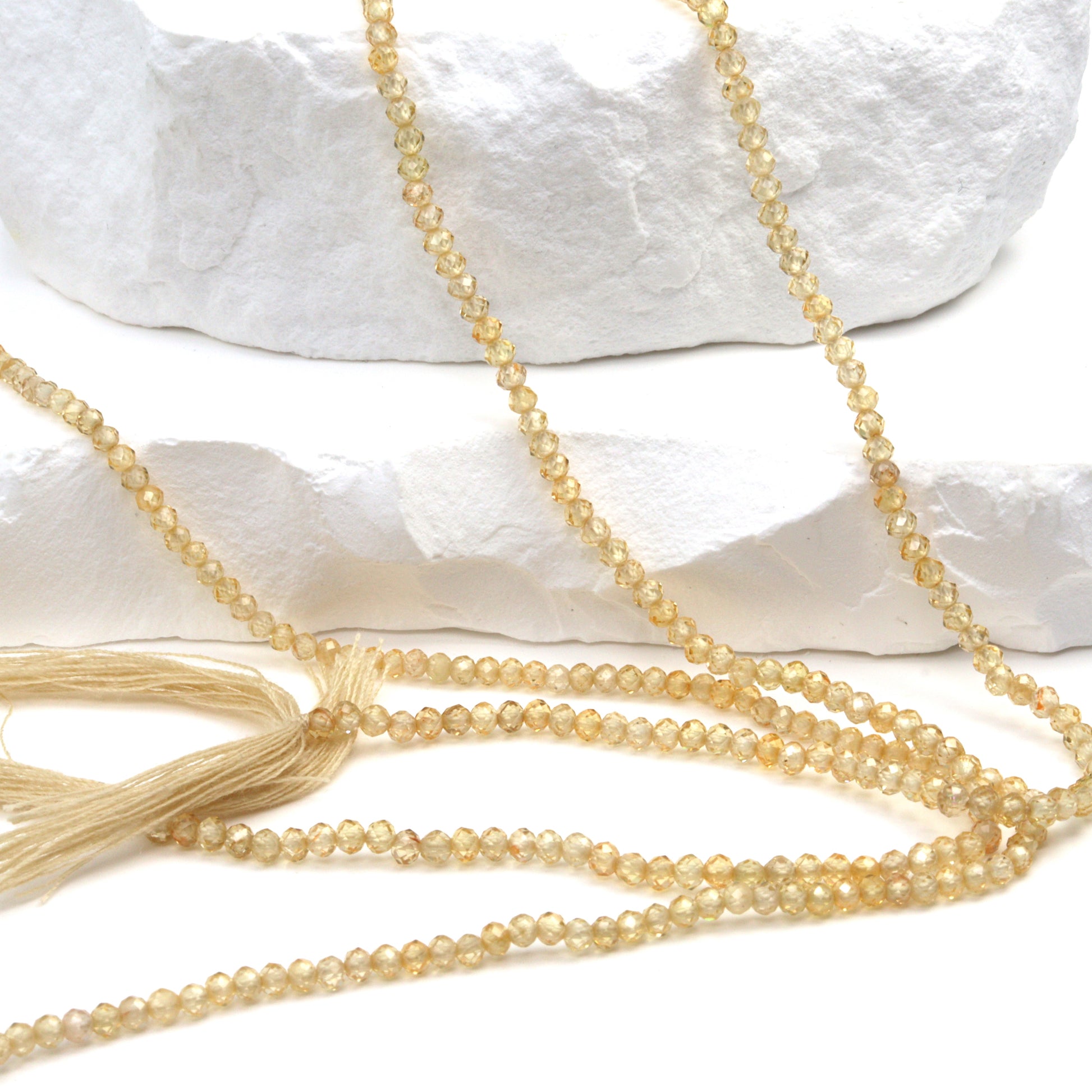 Discover the radiant beauty of our 13" Full Bead Strand of Yellow Zircon Faceted Rondelles. These 2.5mm beads are meticulously crafted to showcase the vibrant hue and brilliant sparkle of yellow zircon, a gemstone cherished for its unique color and luster. Ideal for jewelry designers and stores, these wholesale gemstone beads can be transformed into stunning necklaces, bracelets, earrings, and more. Each bead is faceted to enhance its natural shine, making every piece of jewelry you create a true masterpiece. Add a touch of sunshine to your collection with our Yellow Zircon Faceted Rondelles.